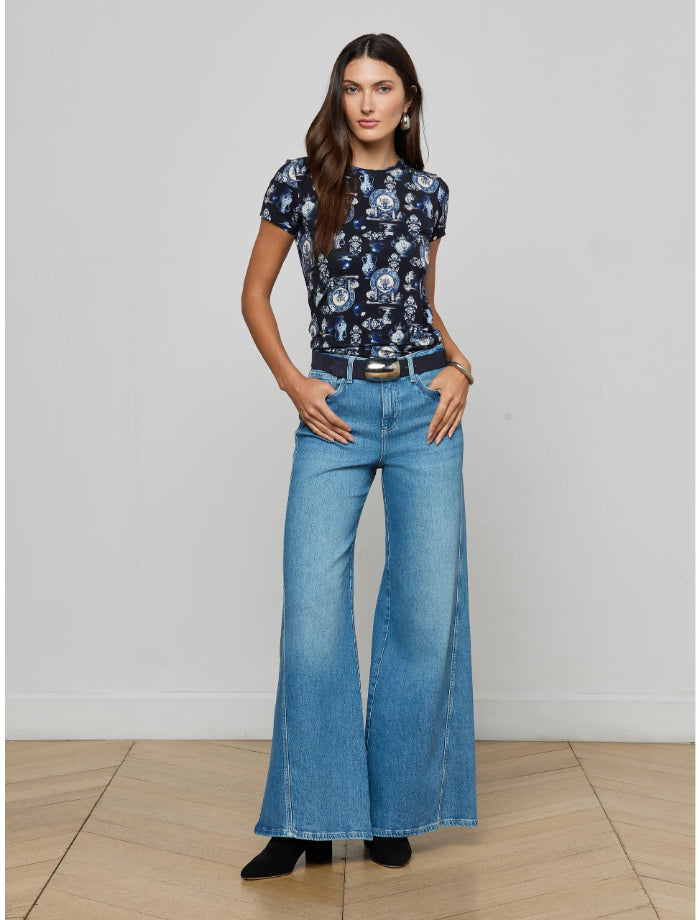 L'Agence Ressi short sleeve tea in a stretch jersey knit and a soft, flattering slim cut.
