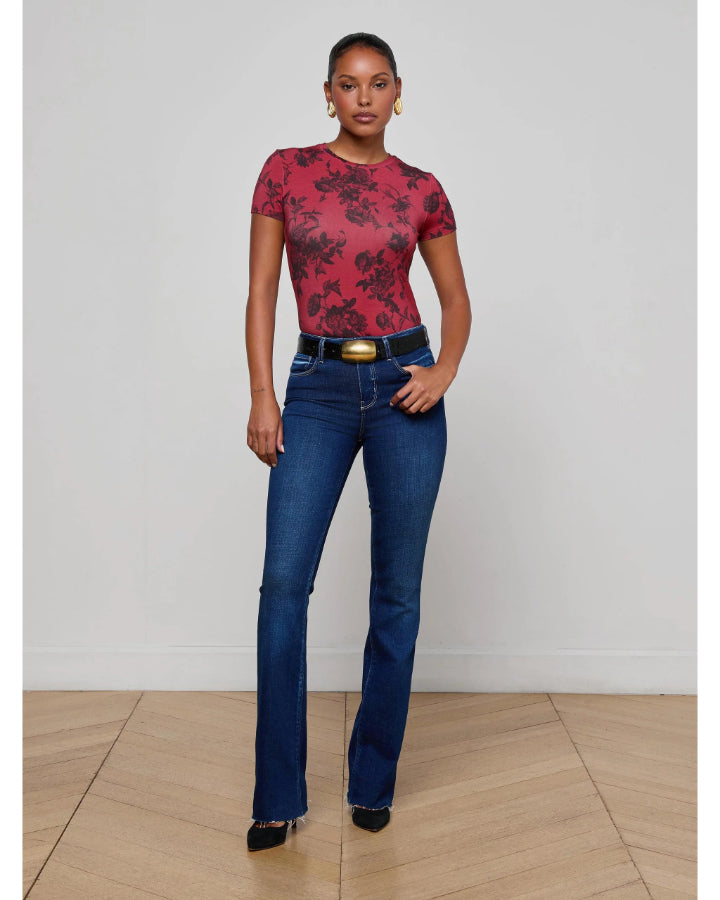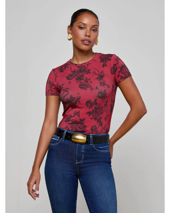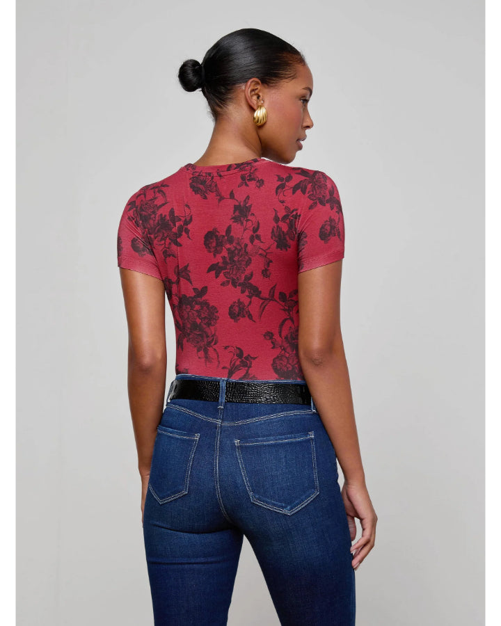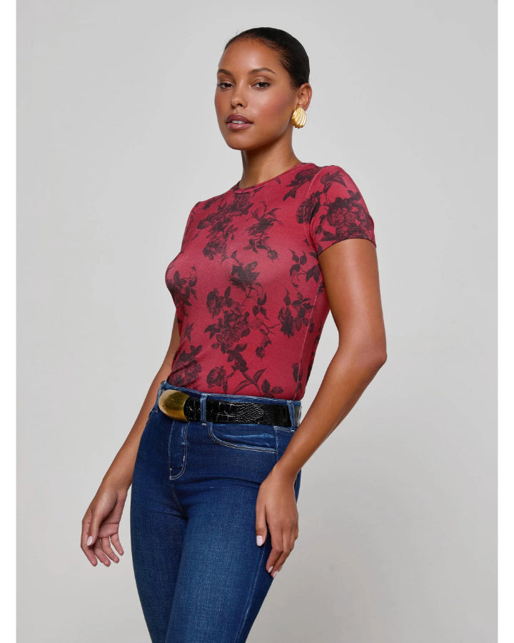 L'Agence quintessential slim fit tee in a painterly floral print, supple microfiber stretch fabric with crew neck and short sleeves, Size XS - Length 24.75", Sleeve Length 5.25"