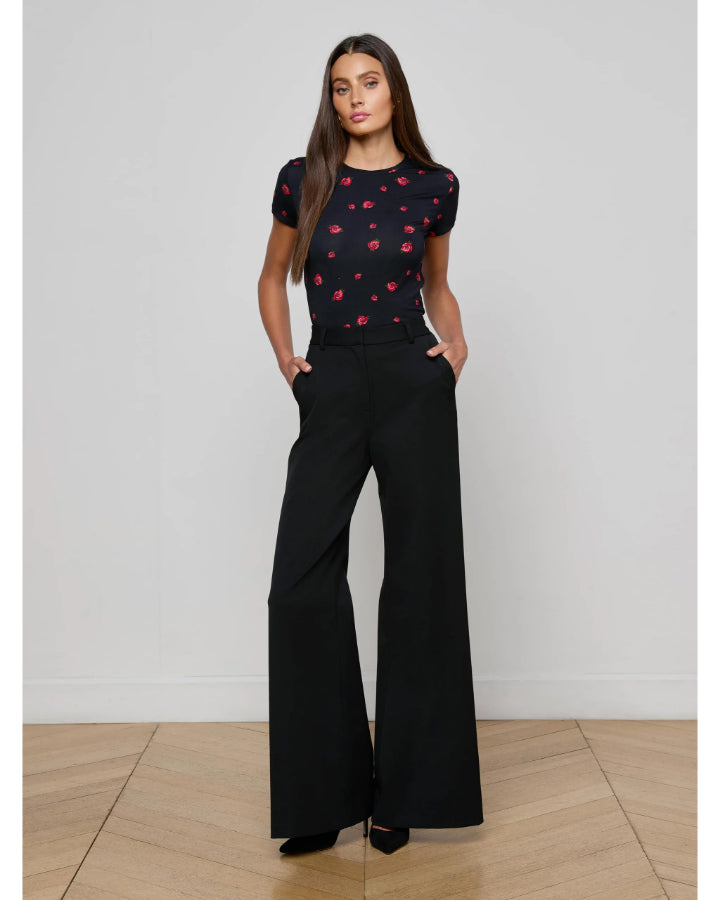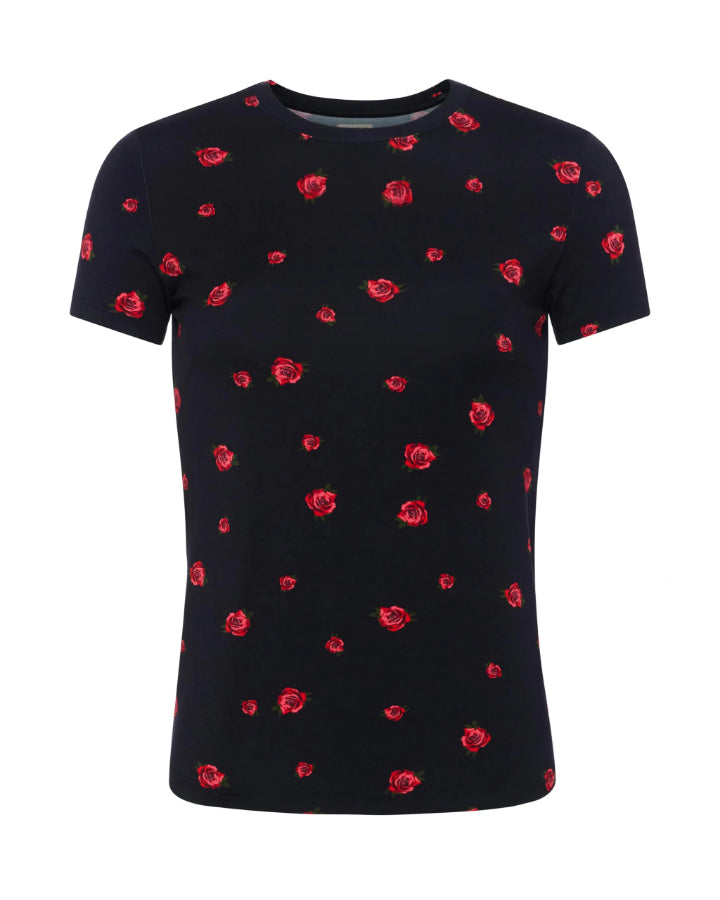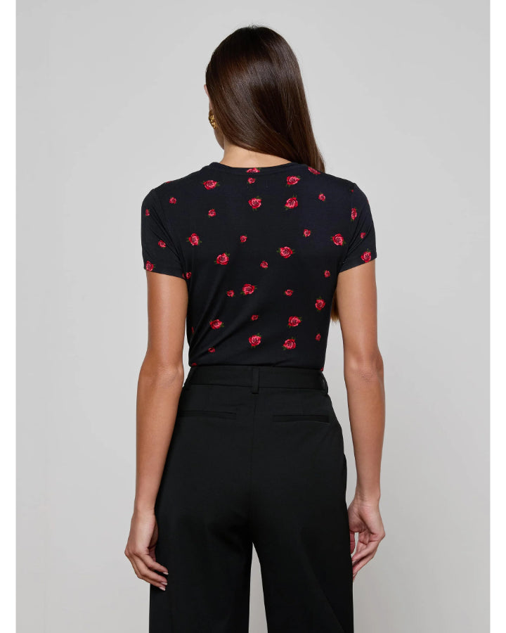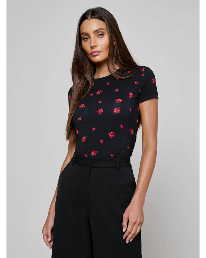 L'Agence quintessential slim fit tee in a red rose embroidery, supple microfiber stretch fabric with crew neck and short sleeves, Size XS - Length 24.75", Sleeve Length 5.25"