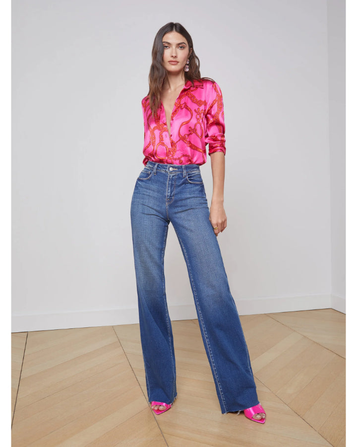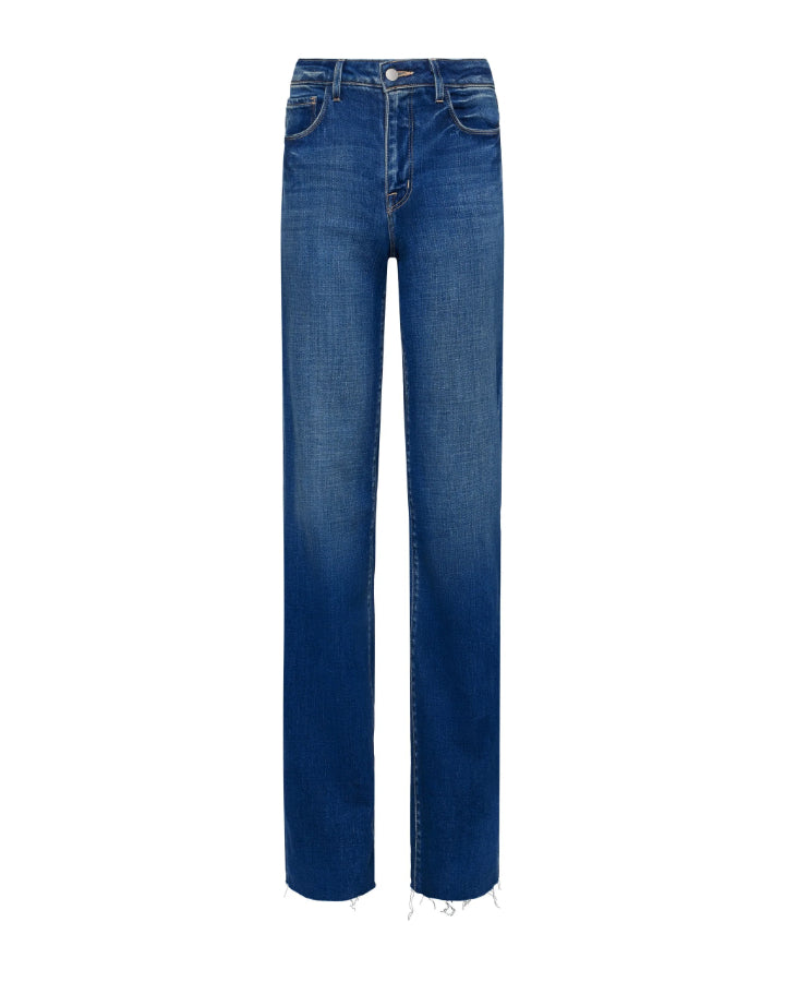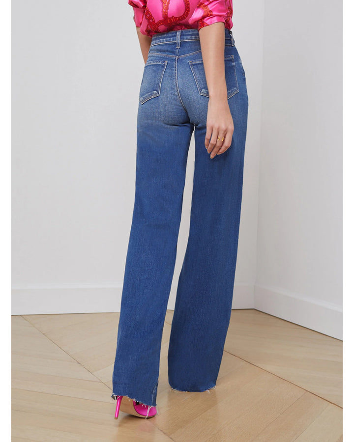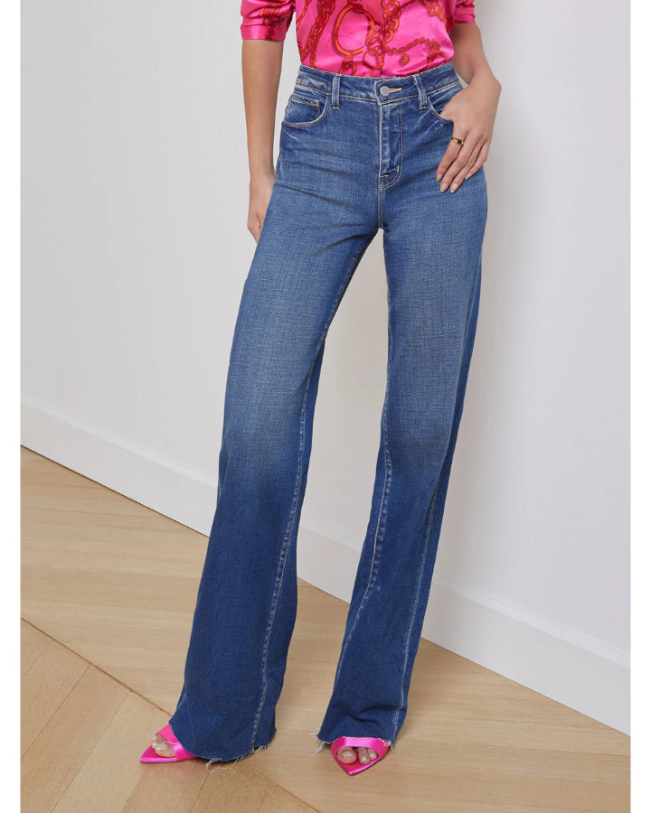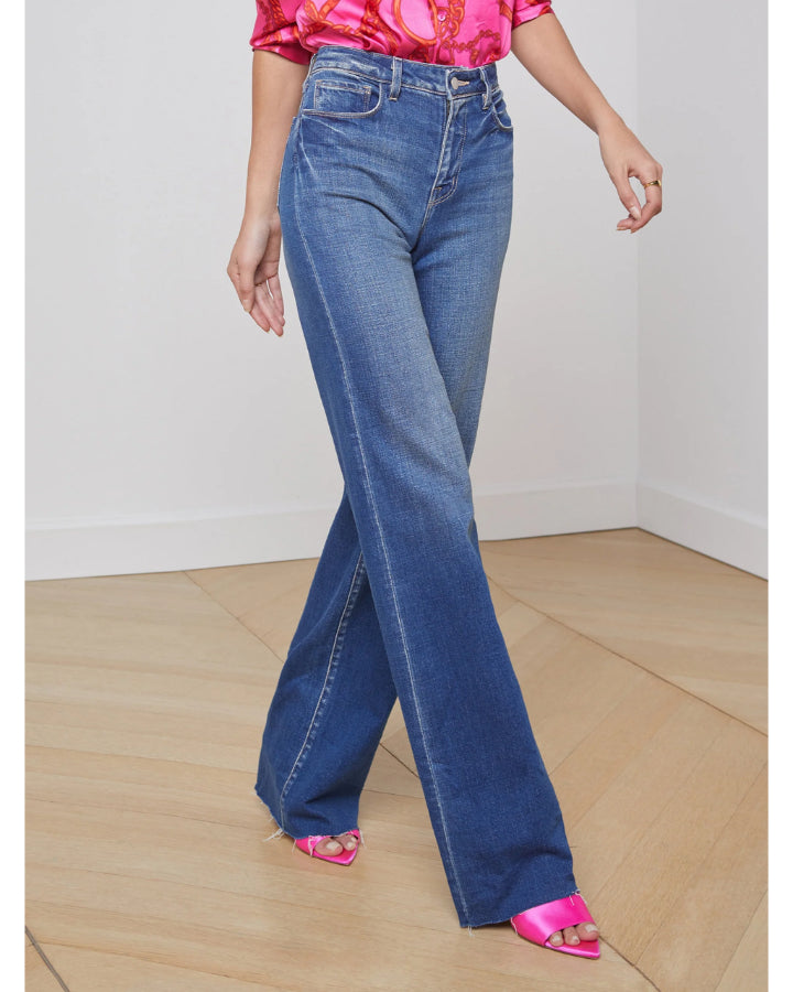L'Agence wide leg jean hugs from high-rise contoured waistband to hip, before draping into a wide leg for a perfectly proportioned look. Classic five pocket styling with button and zip closure. Size 25 - Rise 10", Inseam 32", Leg Opening 20".