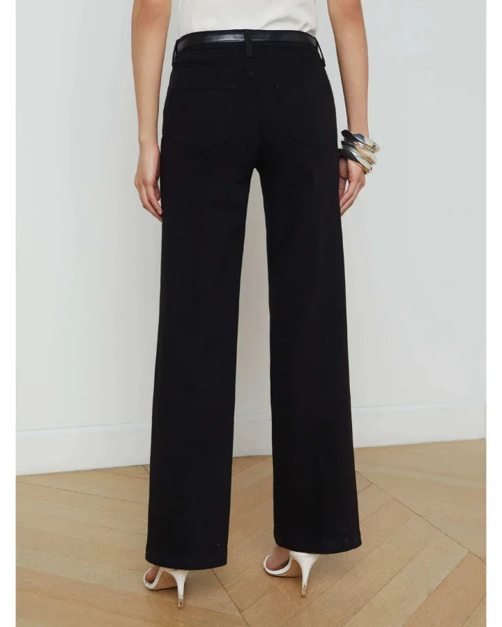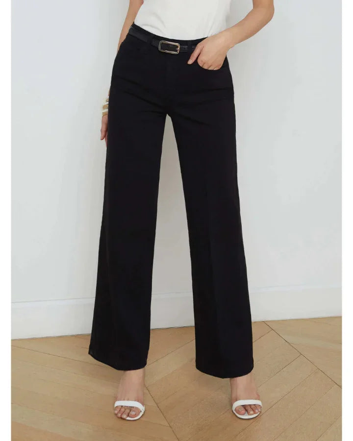 L'Agence wide leg jean hugs from high-rise contoured waistband to hip, before draping into a wide leg for a perfectly proportioned look. Classic five pocket styling with button and zip closure. Size 25 - Rise 10", Inseam 32", Leg Opening 20".