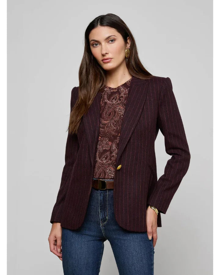 L'Agence longline silhouette sleek burgundy pinstripe blazer designed to hit below the hip features classic peak lapel, single button closure, welt pockets and shoulder pads. Size 2 - Length 29.25", Sleeve Length 24".