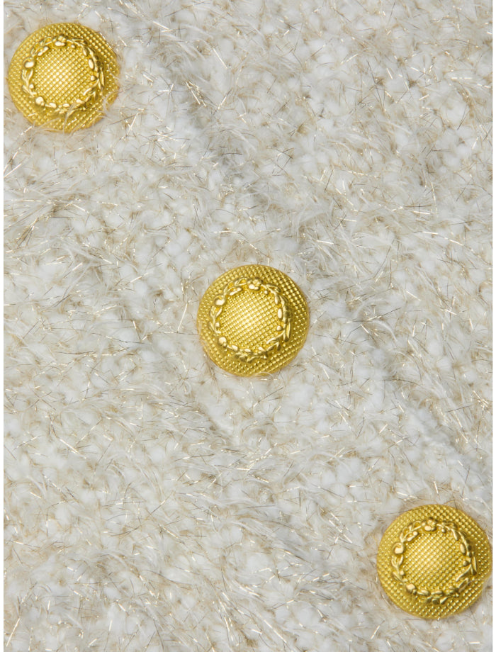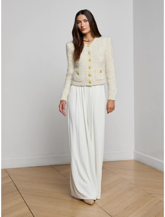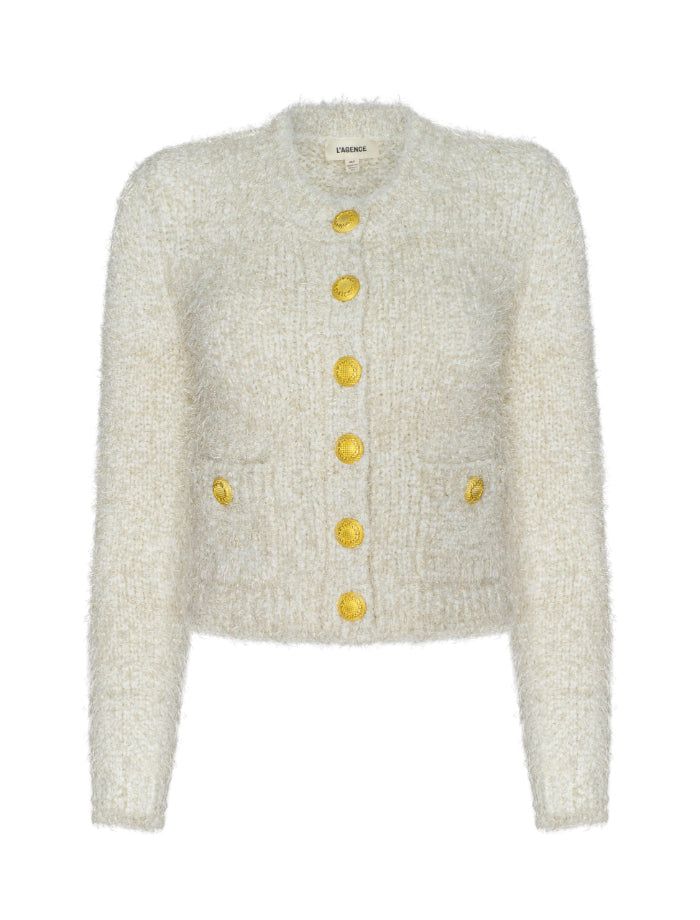 L'Agence Una cardigan crafted from an eyelash knit in a tailored silhouette. Features golden buttons, patch pockets, shoulder pads, and a round neckline.