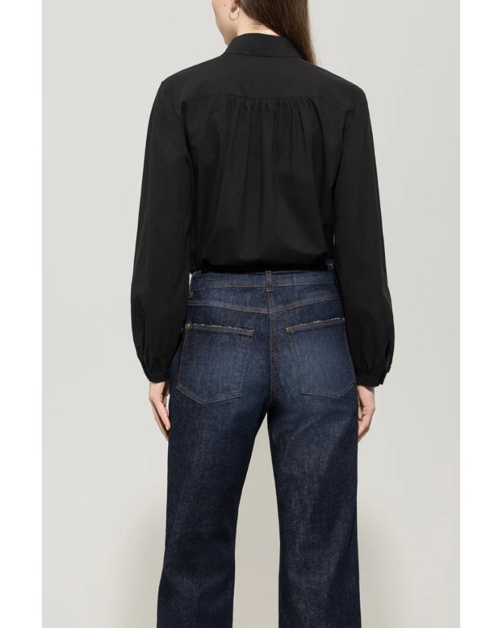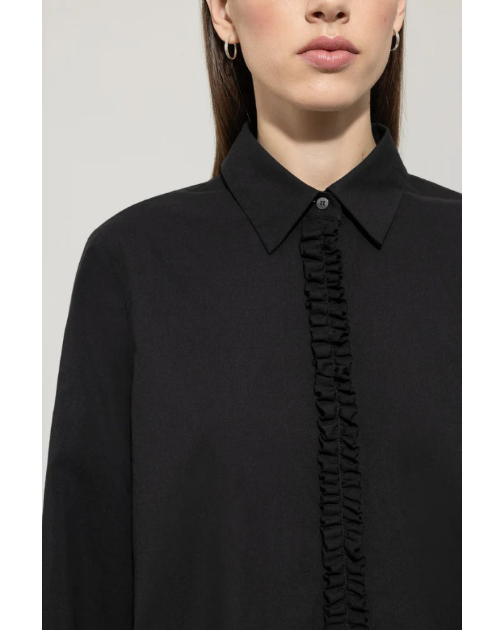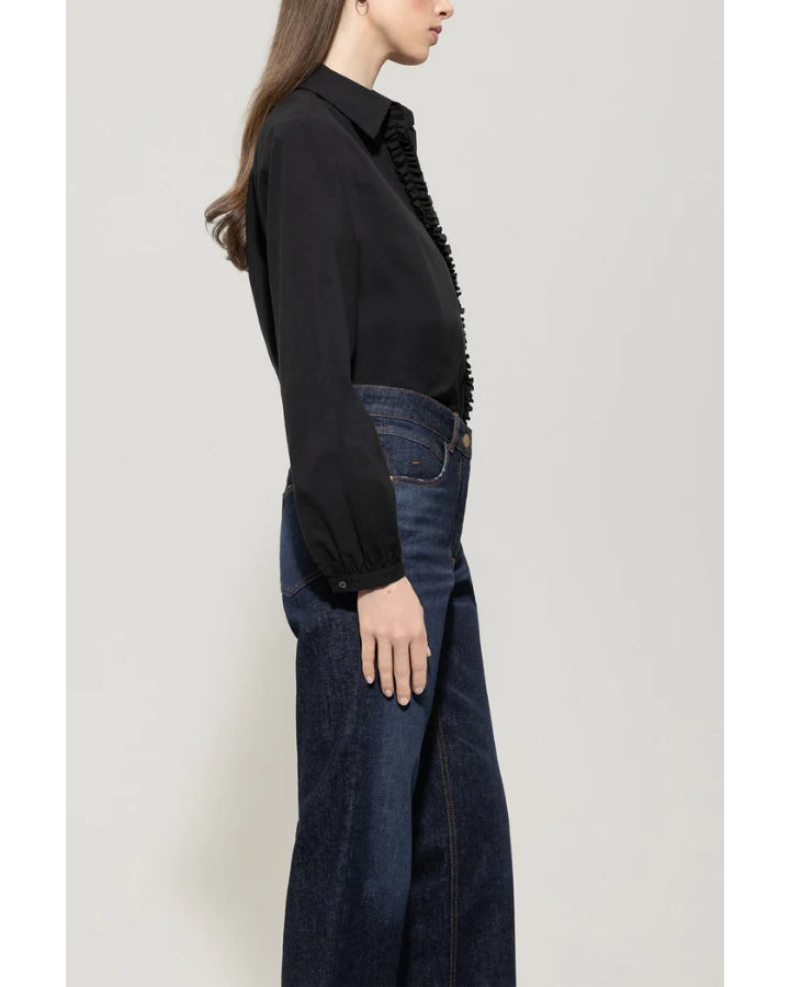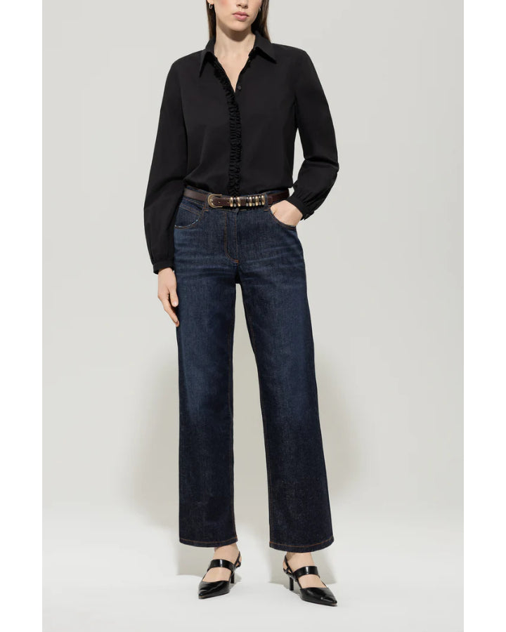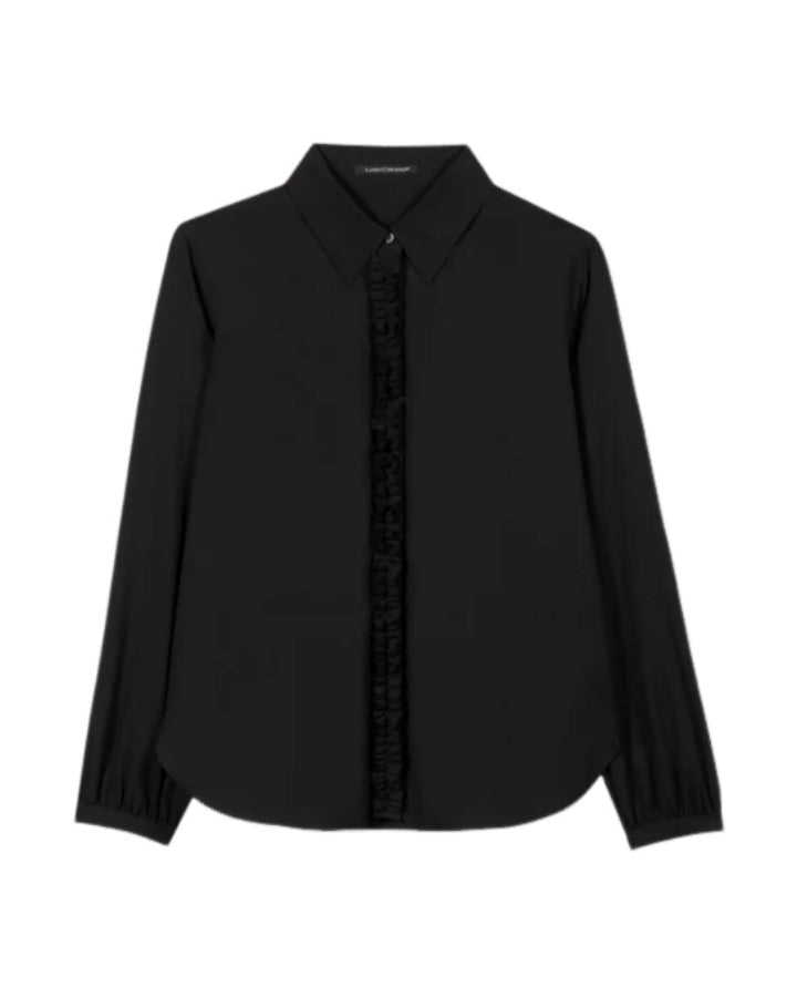 Luisa Cerano lightweight cotton voile wide-cut blouse with a full-length button placket is trimmed with fine ruffles, buttoned cuffs and rounded hem.