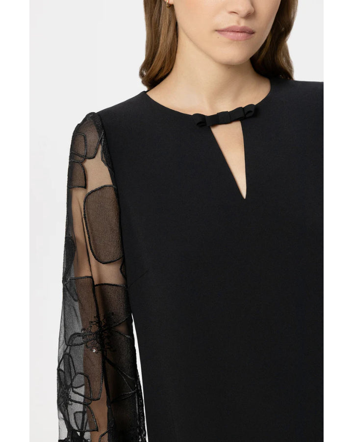Luisa Cerano flowing triacetate crêpe short, lined dress with a matte finish, transparent ¾ sleeves with floral details and sequin trim are extravagantly designed. A decorative bow is incorporated at the neckline. A long zipper at the back makes it easy to put on and take off.