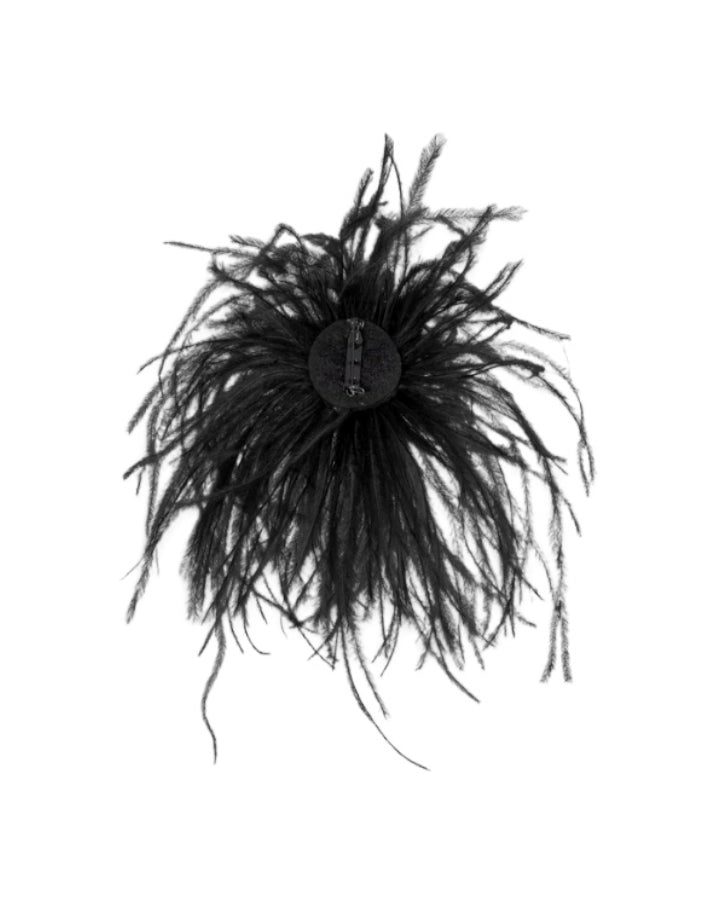 Luisa Cerano extravagant brooch with long, fine ostrich feathers. There is a felt patch on the back with a metal safety pin for fastening.