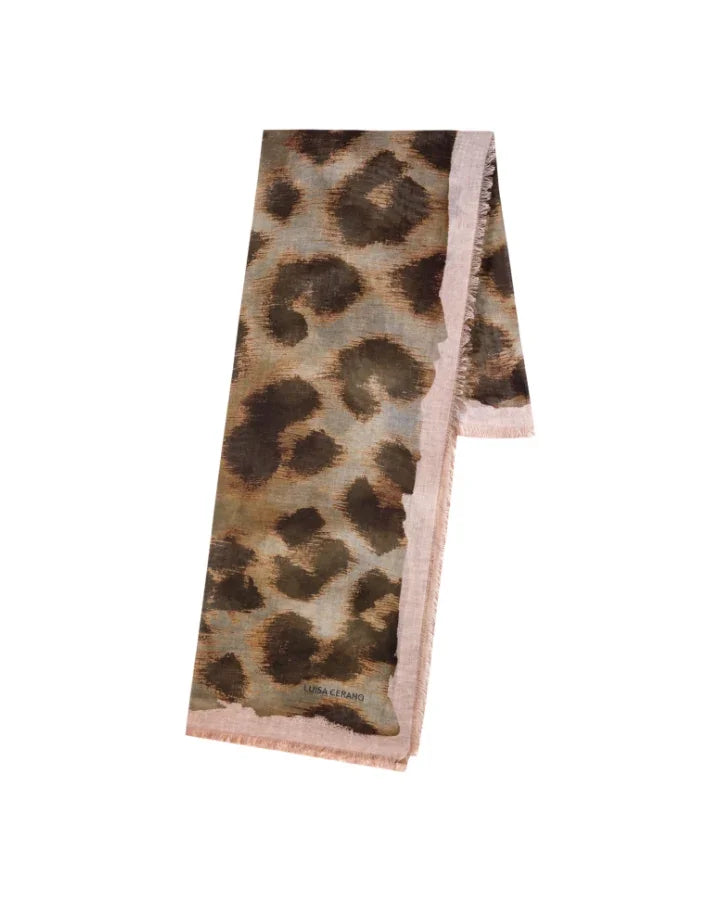 Luisa Cerano square, semi-transparent scarf with an animal print. The edges are finished with fine fringes.