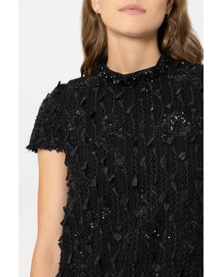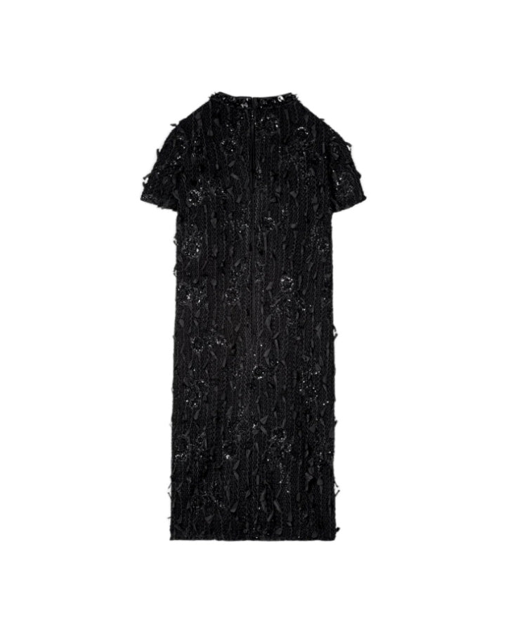 Luisa Cerano tweed lined shift mini dress lavishly embellished with sequins, beads and decorative ribbons. The cap sleeves and hem are finished with raw edges. The round neckline is fastened at the nape with a button.