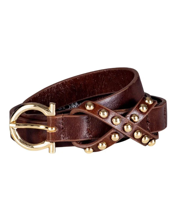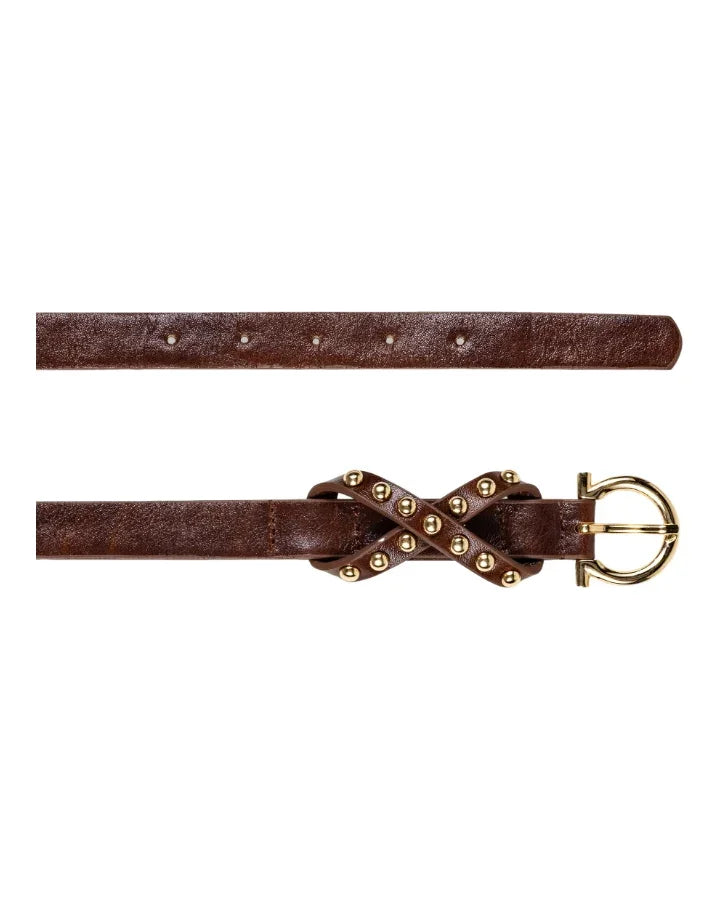 Luisa Cerano pure leather belt with a metal pin buckle. The "X"-shaped loop is studded with golden metal rivets.
