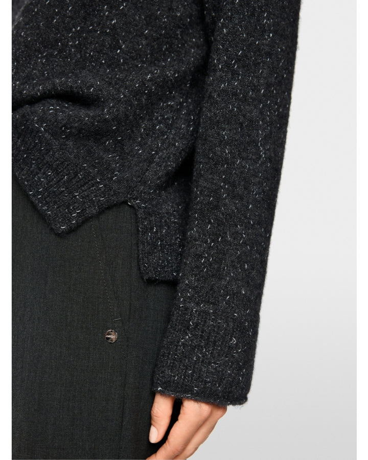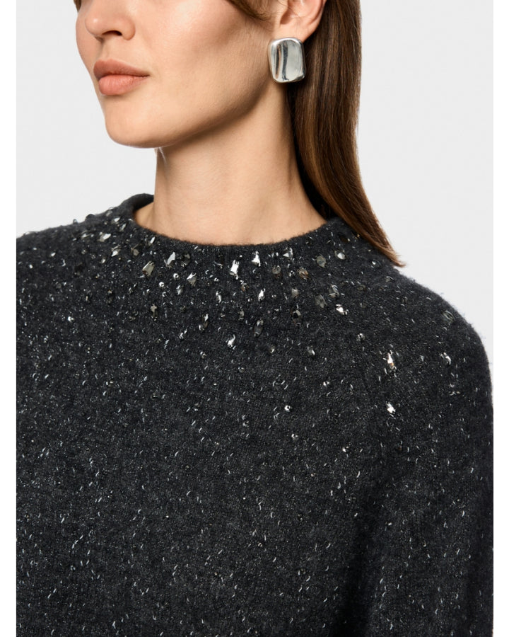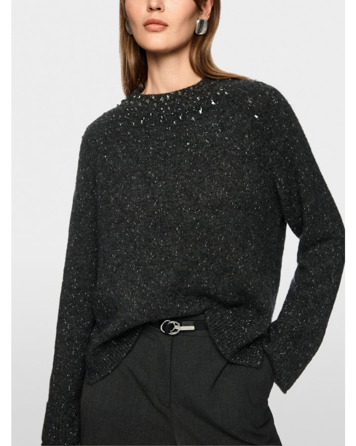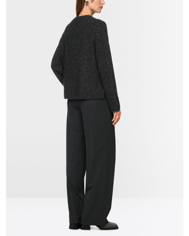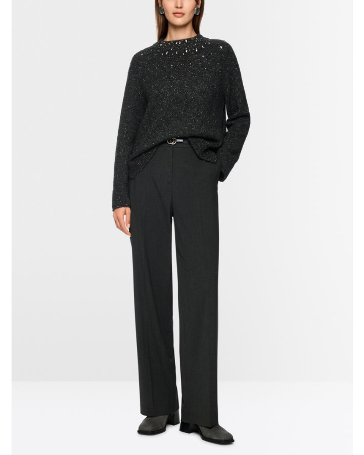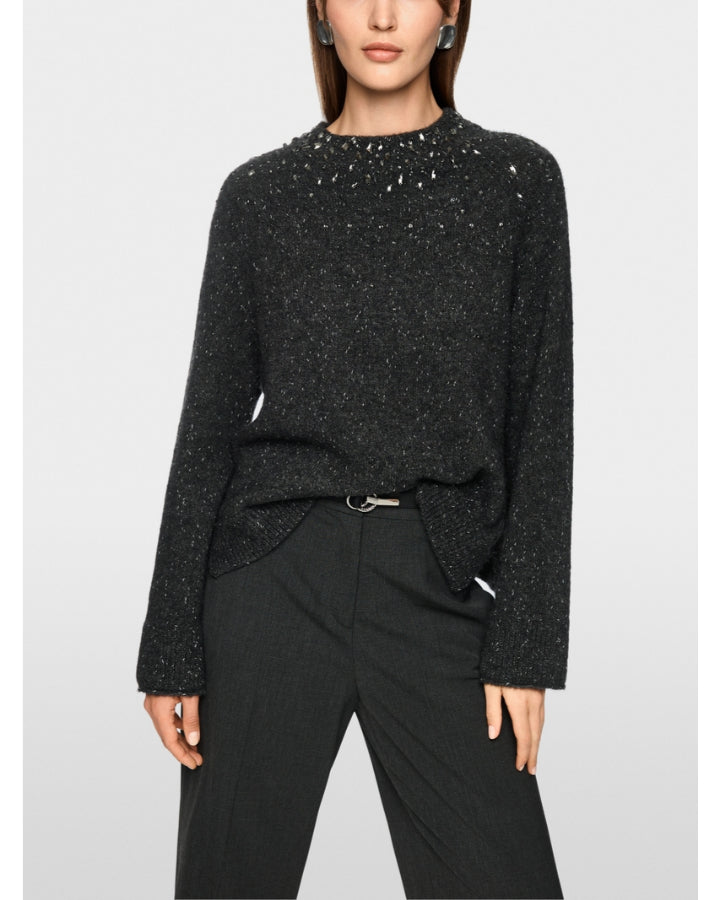 Marc Cain loose fit, soft alpaca blend sweater with sparkling rhinestones and sophisticated lurex yarn details. Features high round neck, ribbed trim and side slits at hem.