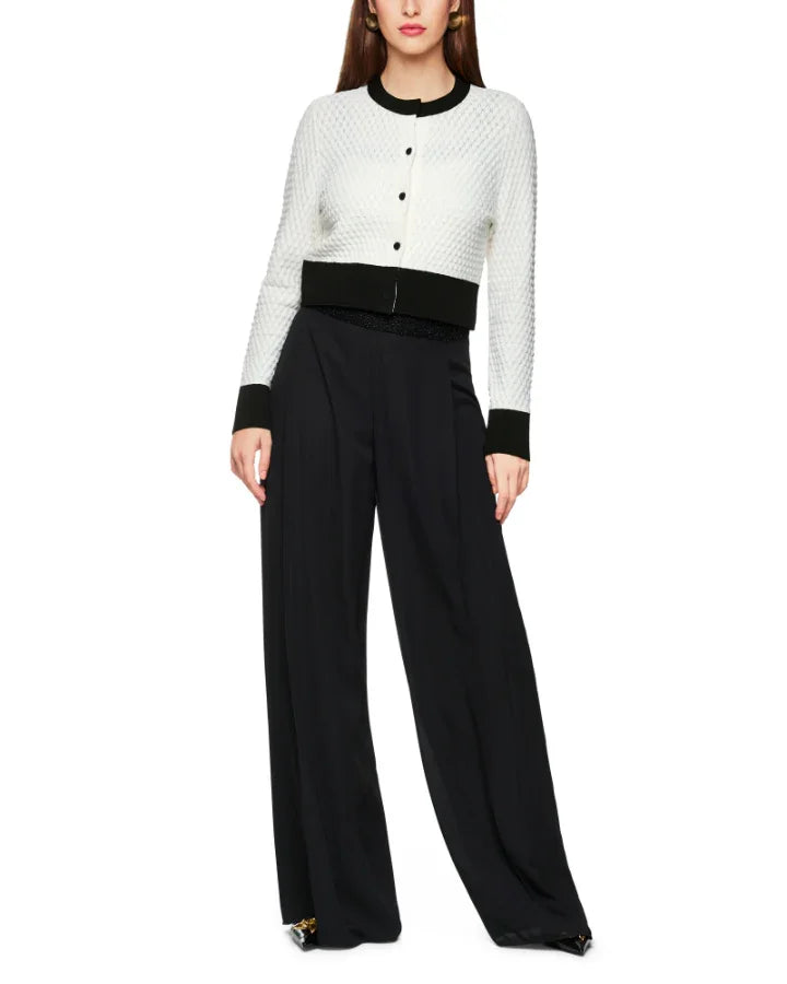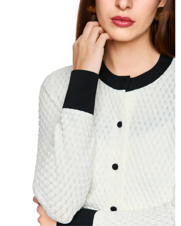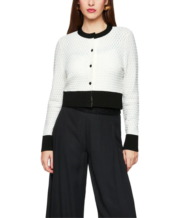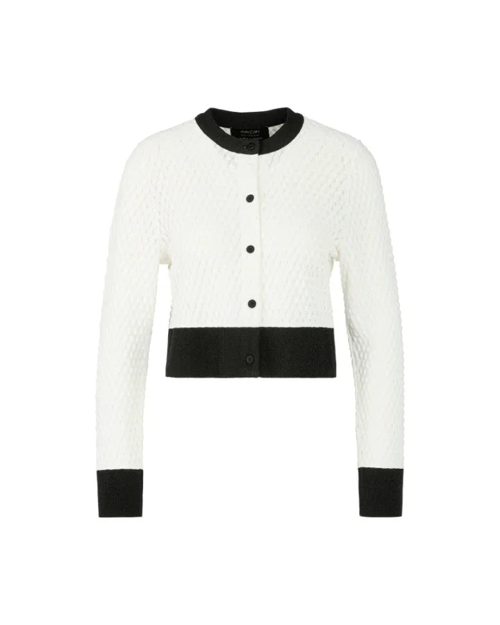 Marc Cain cropped cardigan in an elegant, classic colour scheme and a contemporary design. Features a knit scale pattern and contrasted trims.