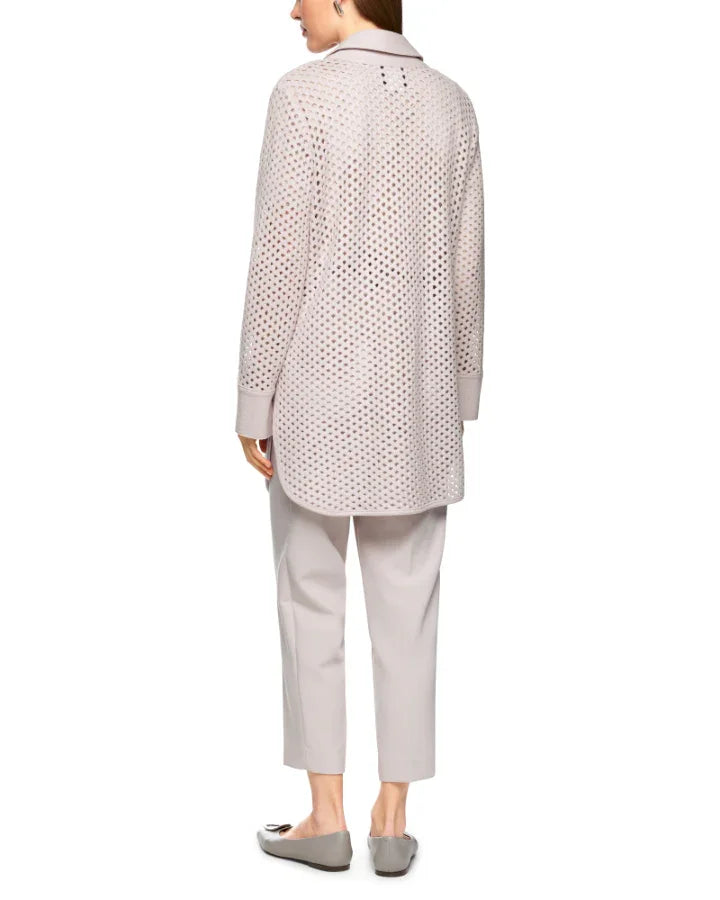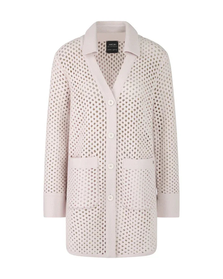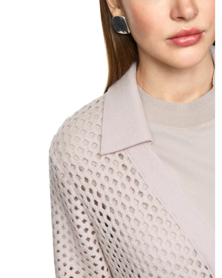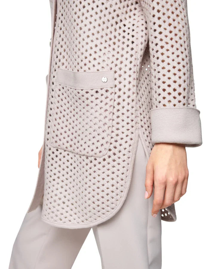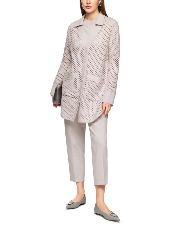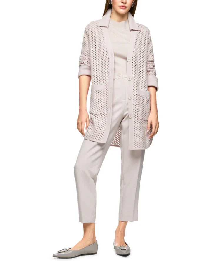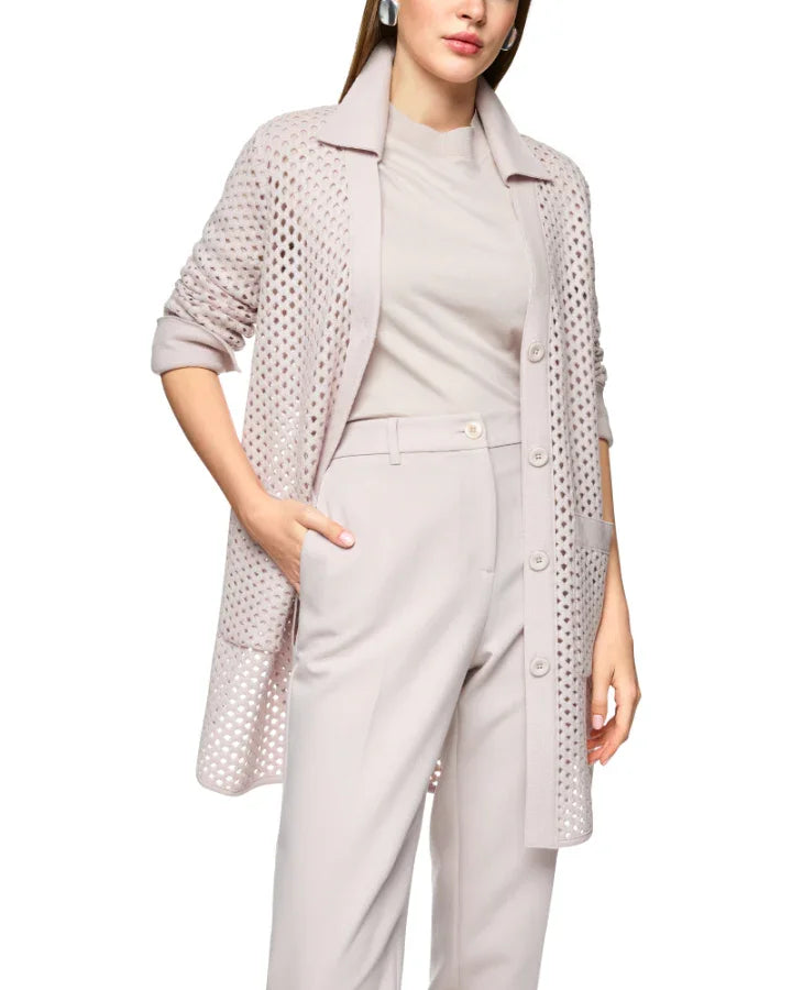 Marc Cain timeless, elegant cardigan in modern texture for an unforgettable look. it features a topstitched button closure, a deep V-neck, two patch pockets, and a straight cut. Sleeves have small slits for comfort.