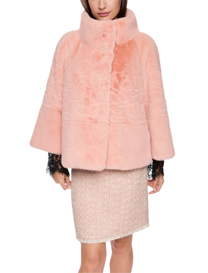 Marc Cain stand out jacket featuring elegant faux fur, which gives it a very soft feel. It comes with a light stand-up collar, wide sleeves and a flared cut. This jacket is lined on the inside for comfort. The side pockets are a practical detail. It fastens with press studs.
