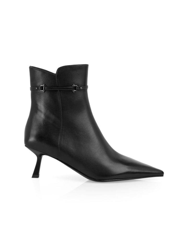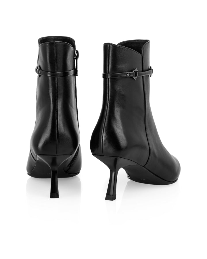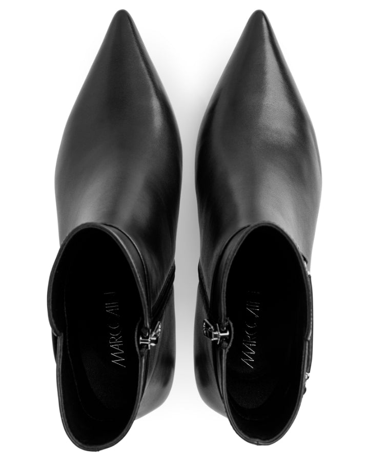 Marc Cain feminine leather ankle boot with leather lining, point toes and narrow 3" heels create an elegant silhouette. Decorative trim adds stylish accents, inside zippers and durable Thunit outsole complete the look.