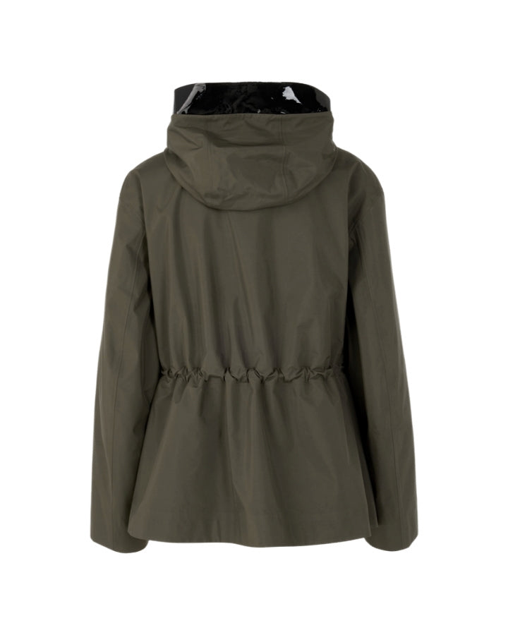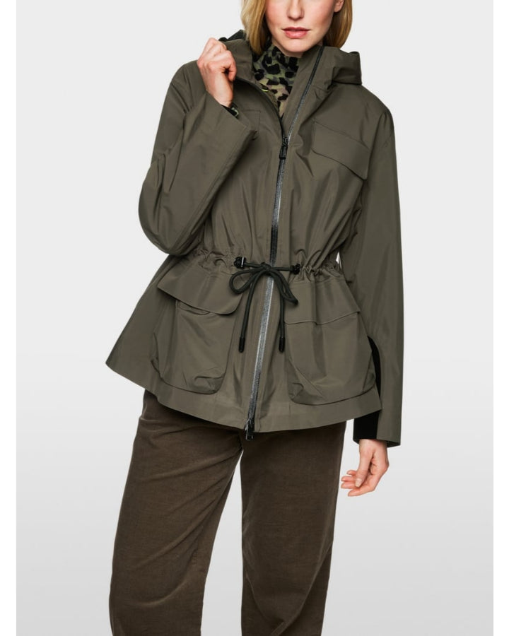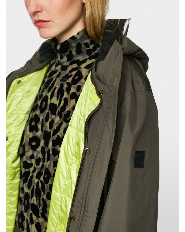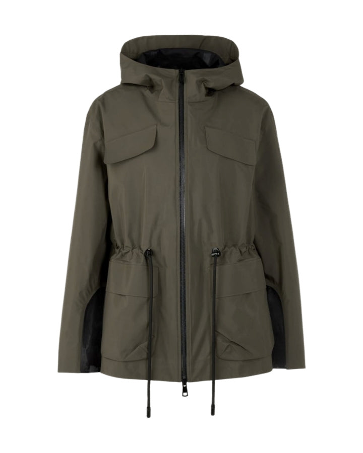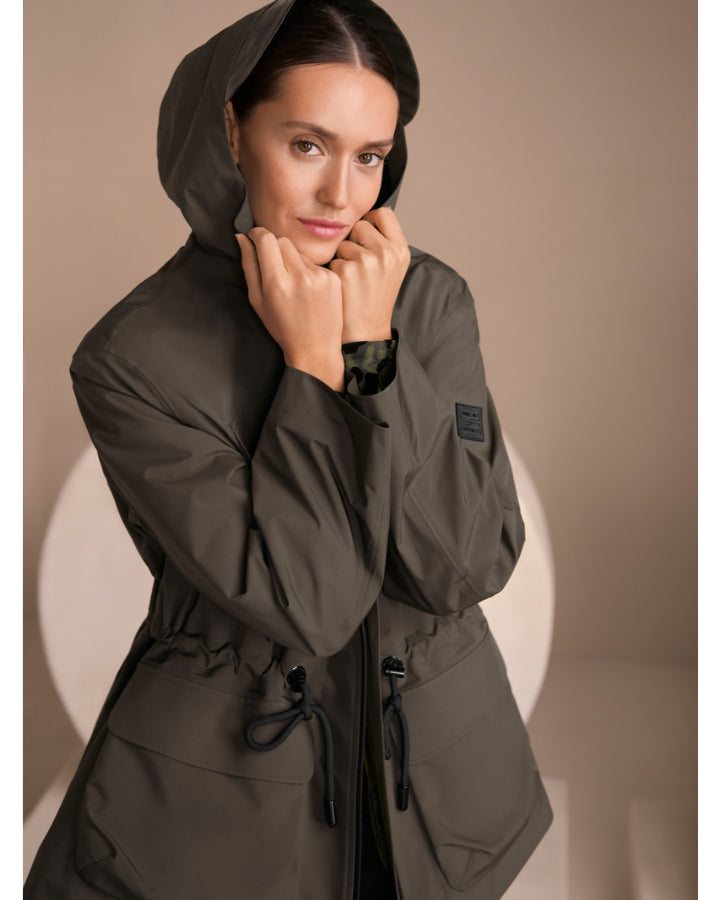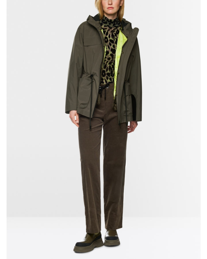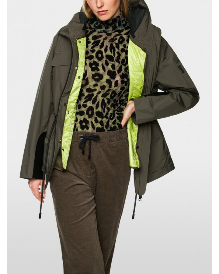 Marc Cain utility jacket has a high collar with a peaked hood, large pockets and a zip fastener. Its straight cut can be adjusted at the waist with a drawstring. Its highlight is the removable softshell inner jacket in a contrasting color – making it ideal for all weather conditions.