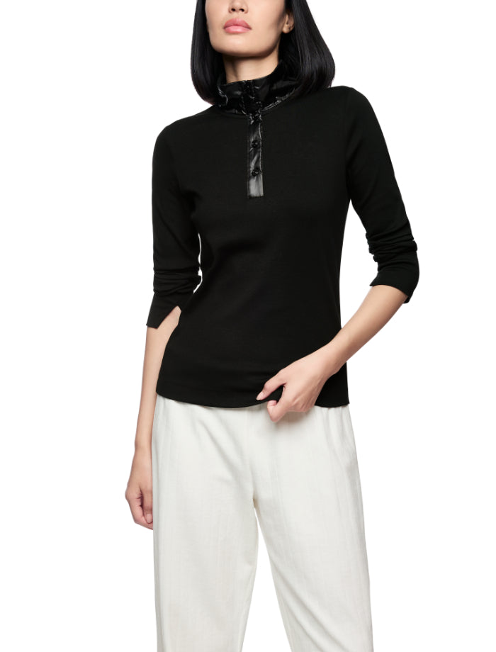Marc Cain ribbed pullover with a stand-up, shiny collar and a short row of press studs. Slim fit.