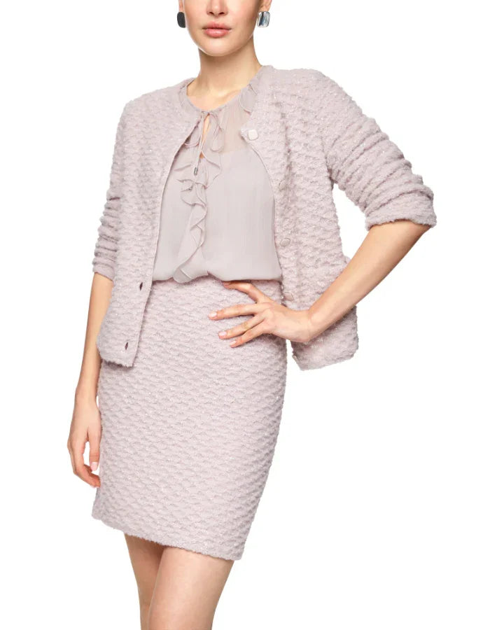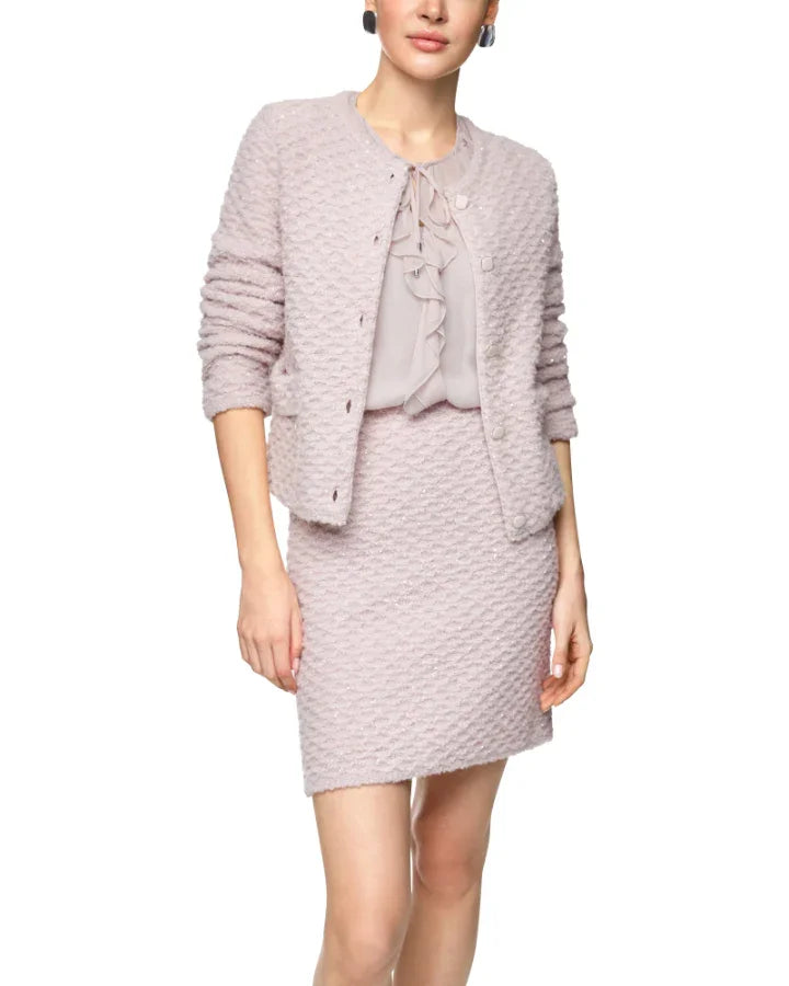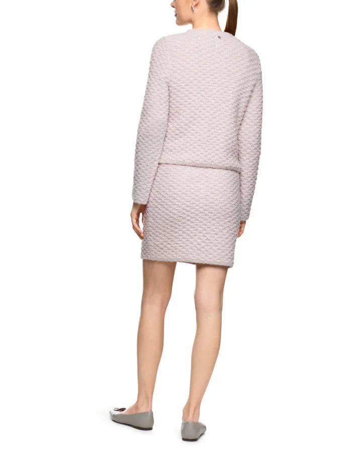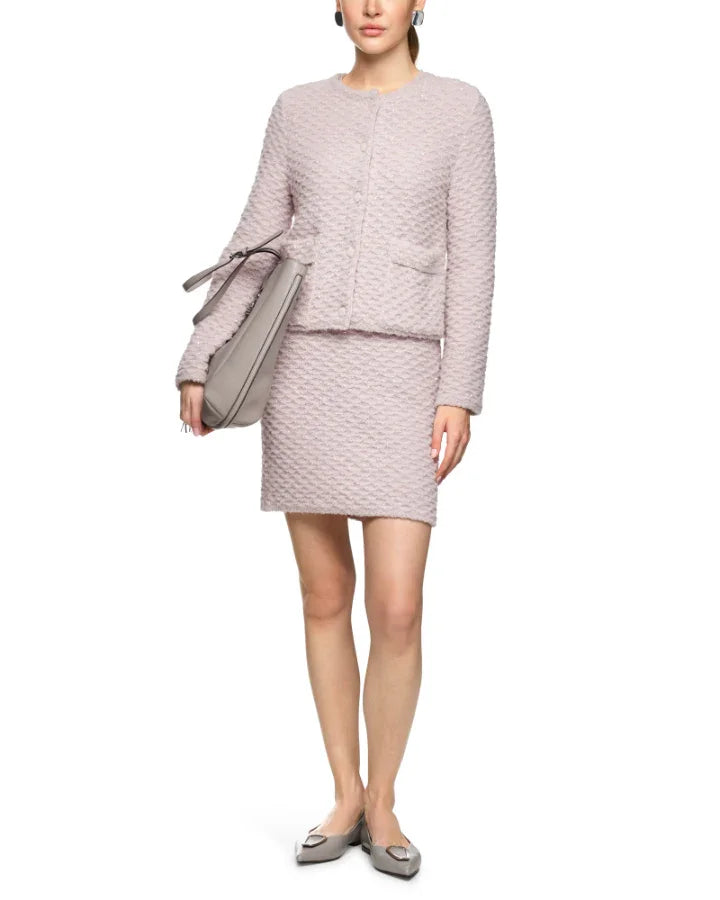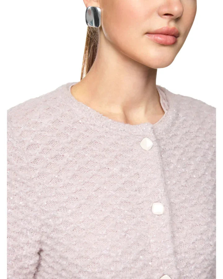 Marc Cain knit jacket in an elegant bouclé style. it features front patch pockets, colour-coordinated buttons, and sequin yarn.