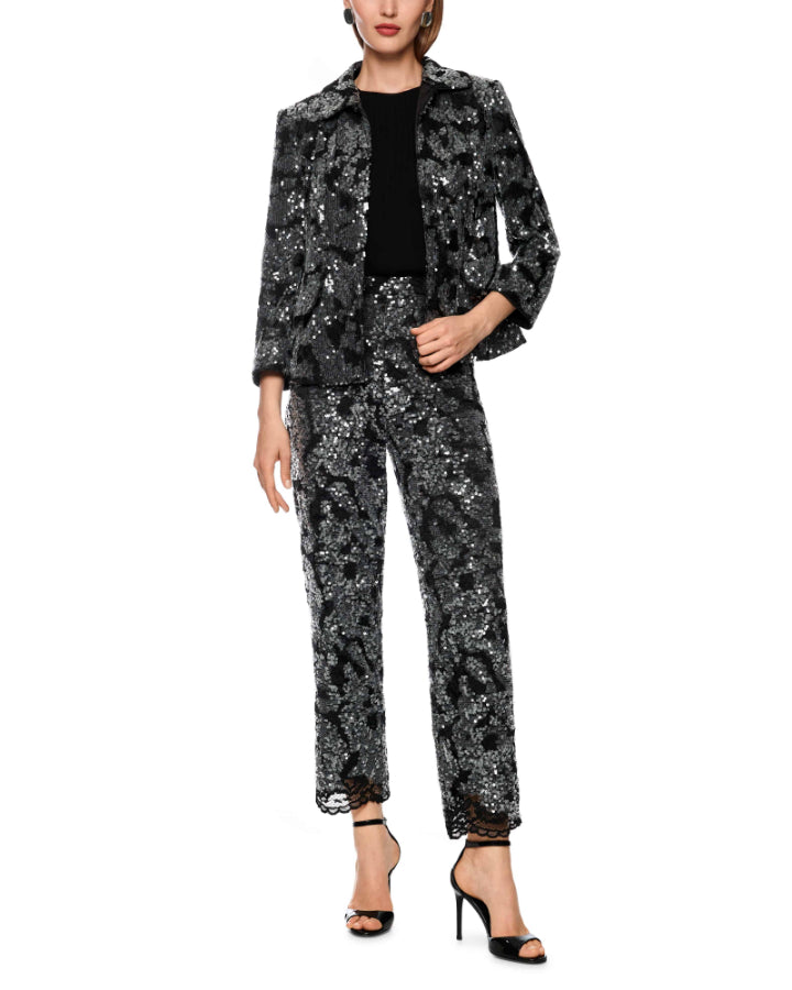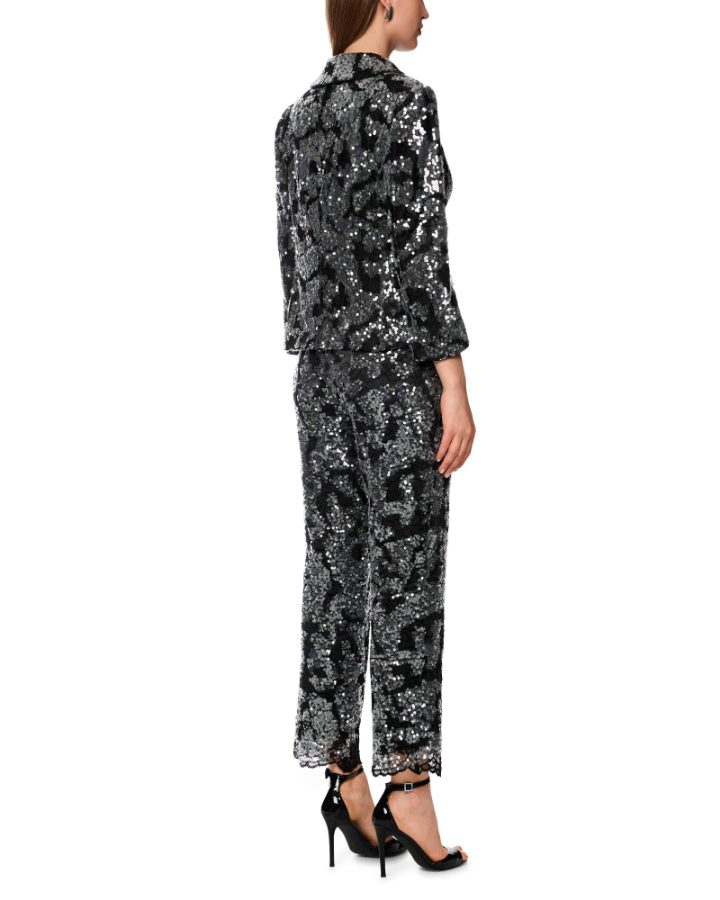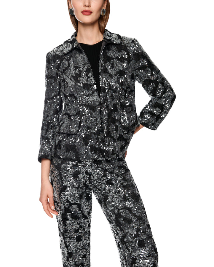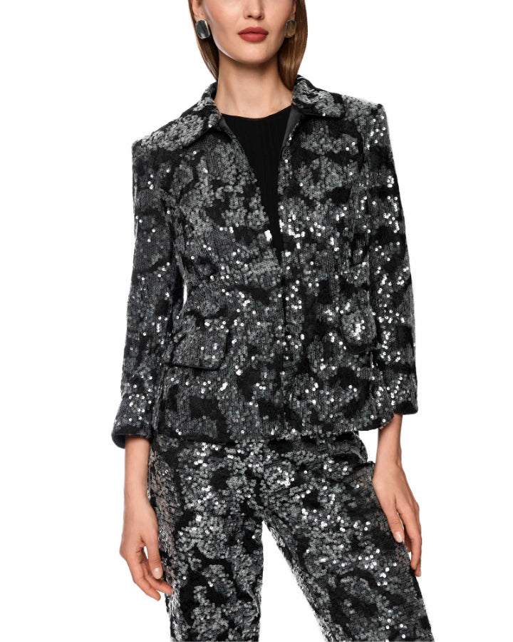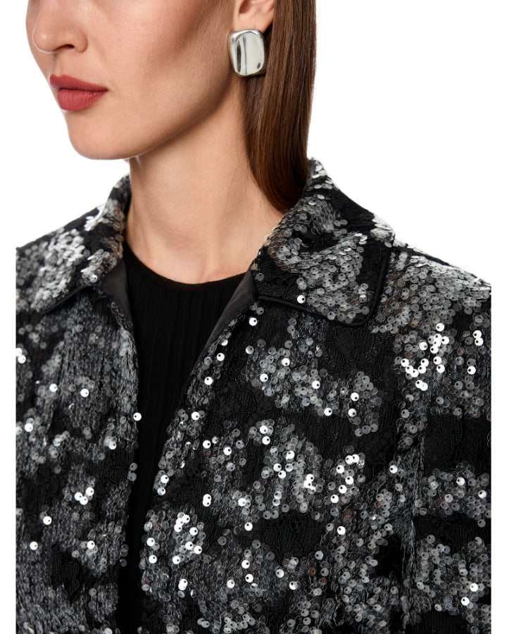 Marc Cain tailored, shimmering lace and sequins slightly cropped jacket features a small collar, front pockets, 3/4 length sleeves and has a straight silhouette. The jacket is lined and fastens with two hooks.