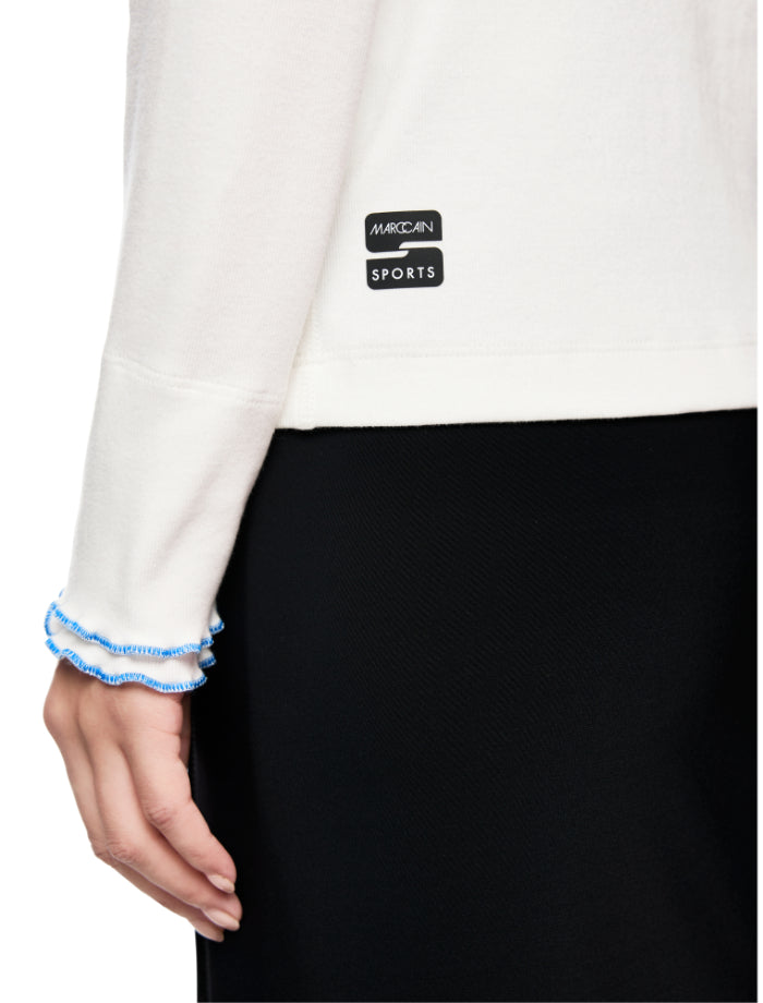 Marc Cain turtleneck with a cotton ribbed ruffle at the neck and a full front print of a confident skier, the Arctic Fox. Rolled hem detail on the sleeves.
