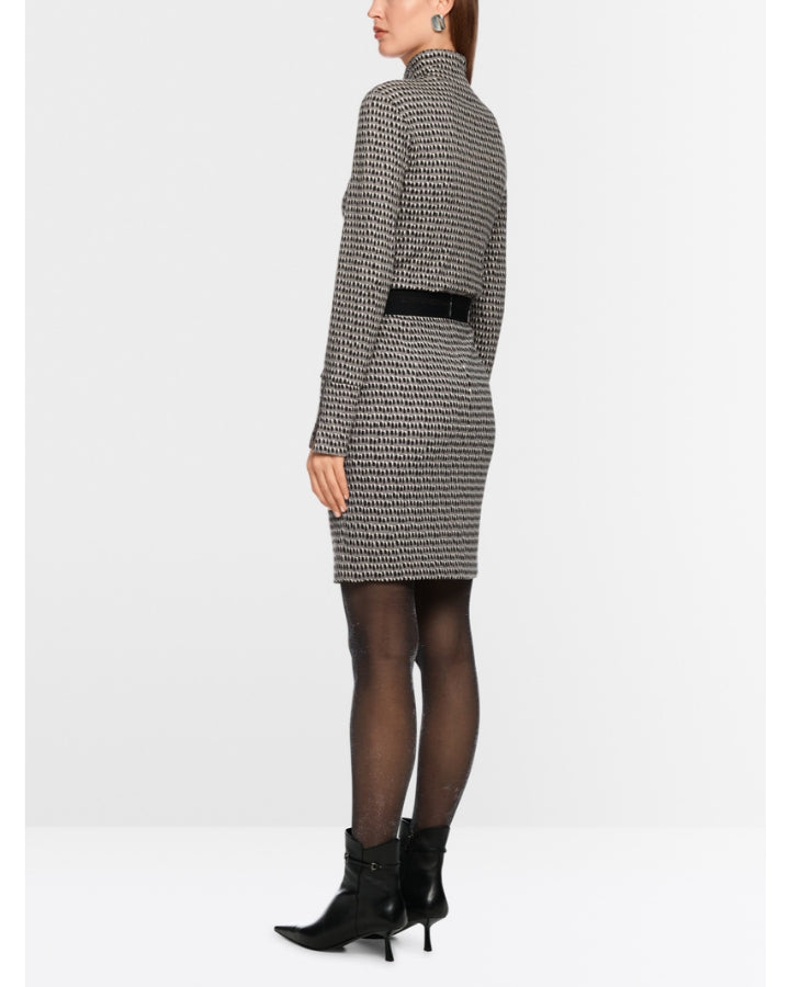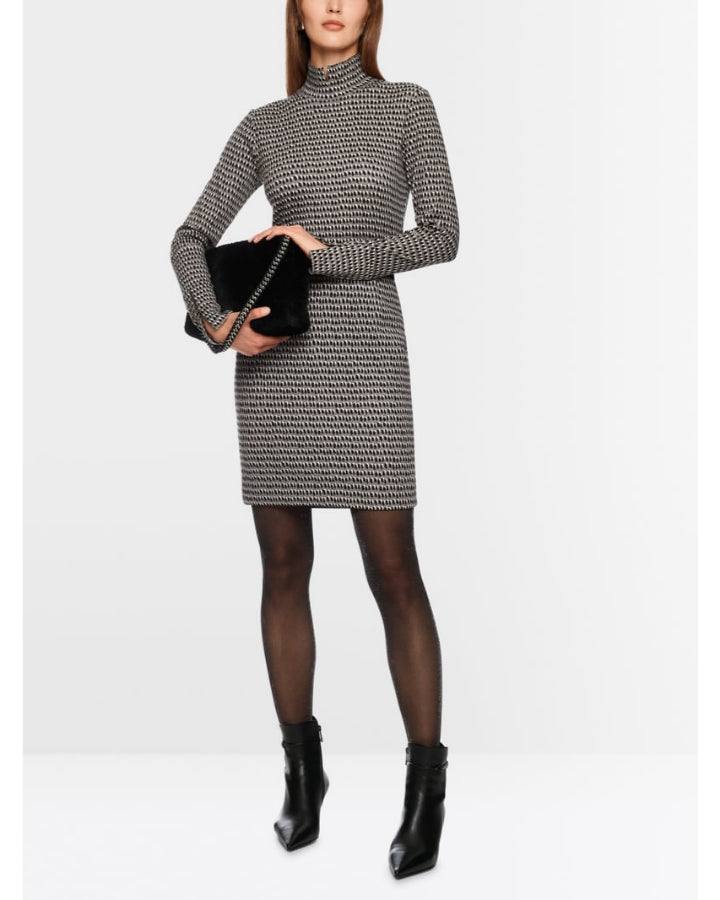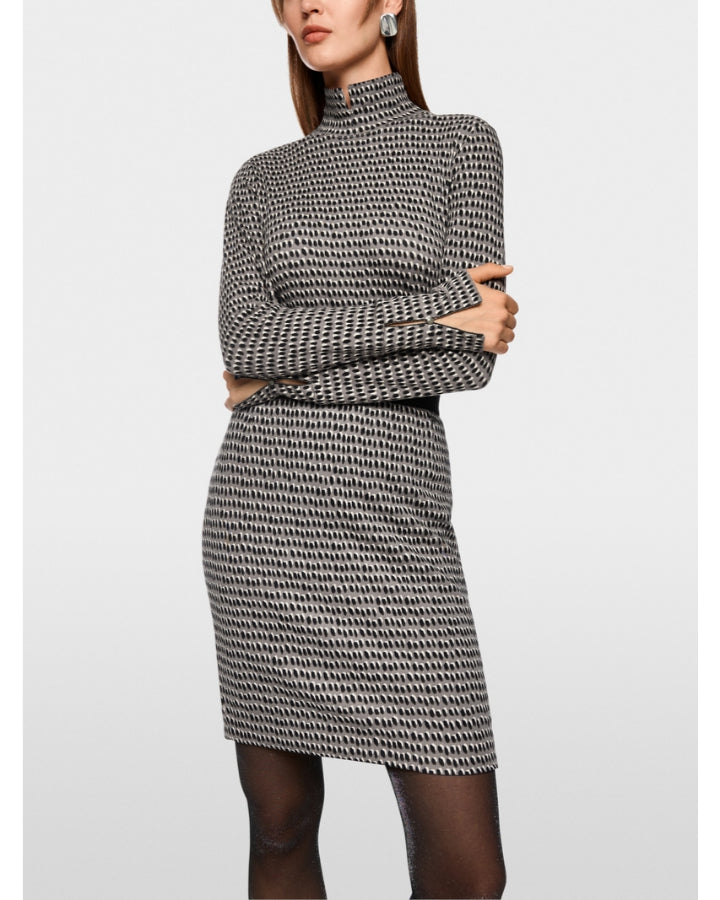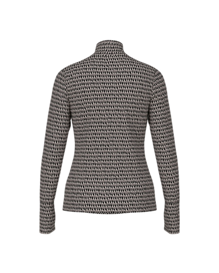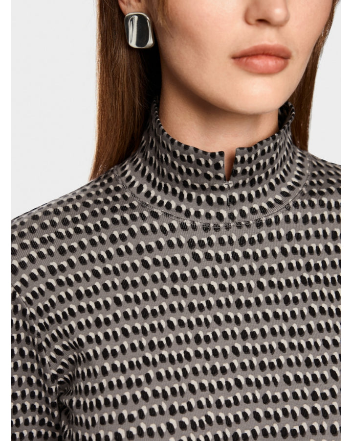 Marc Cain stylish body hugging sprinkles print top in soft stretch cotton for a perfect fit. Features mock neck with slit, long sleeves and long cuffs with button detail.