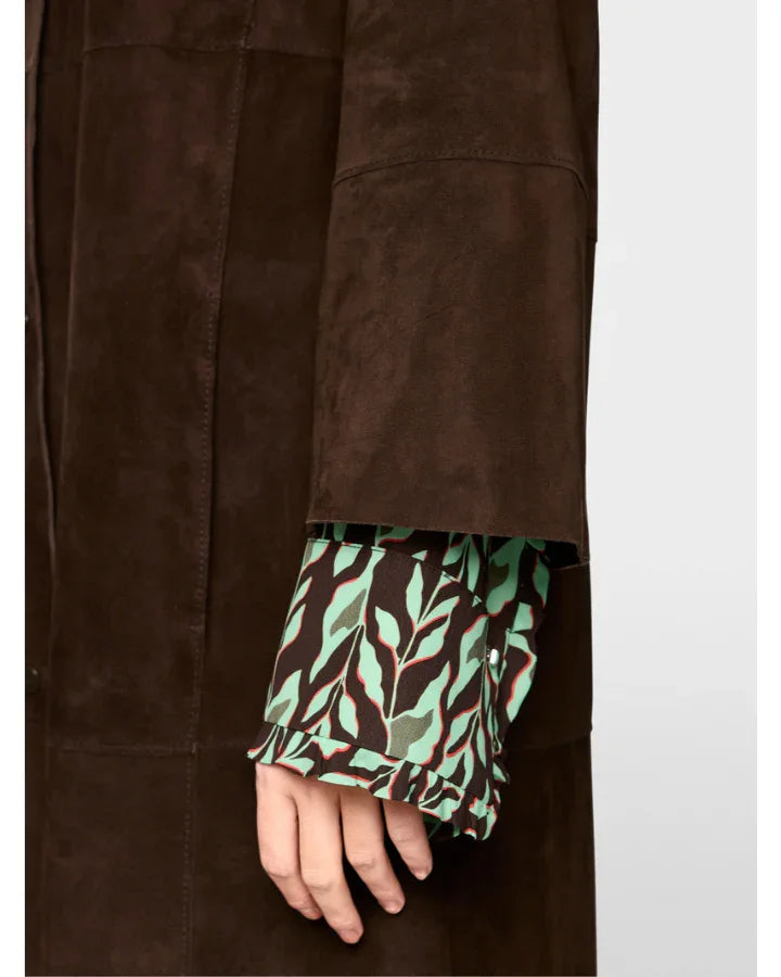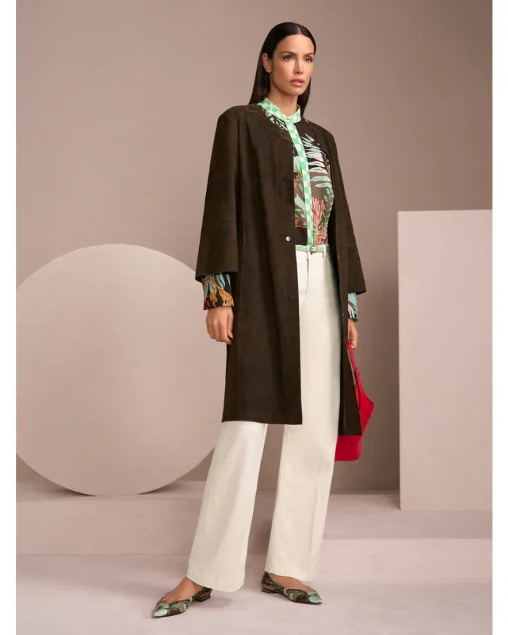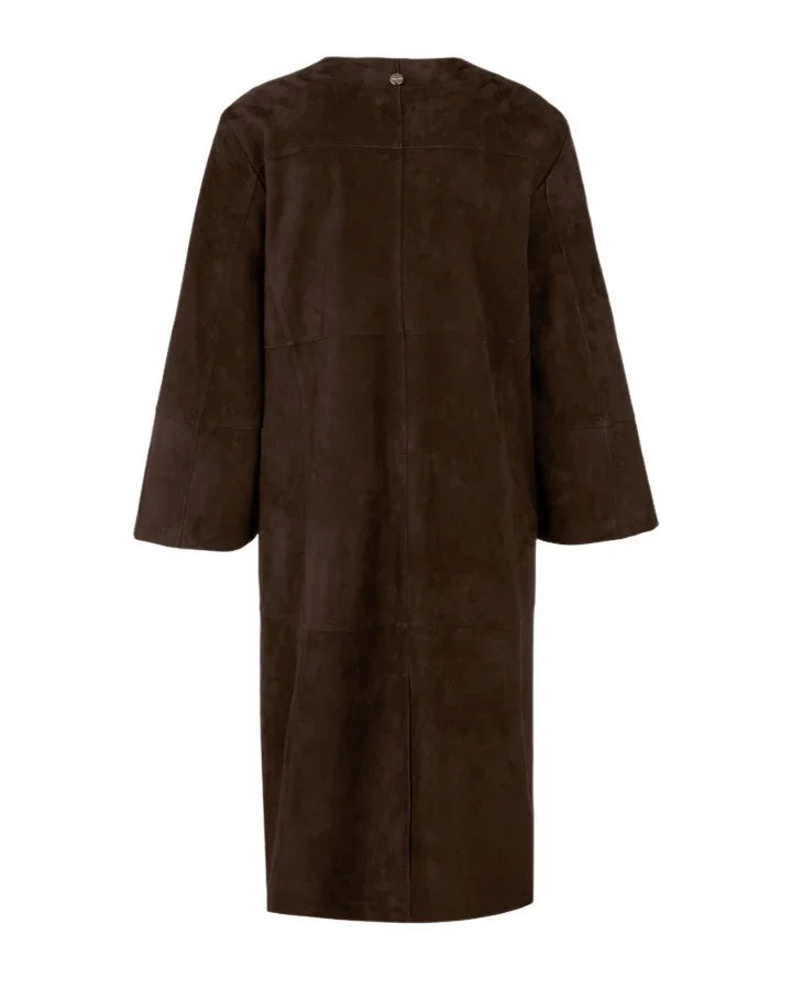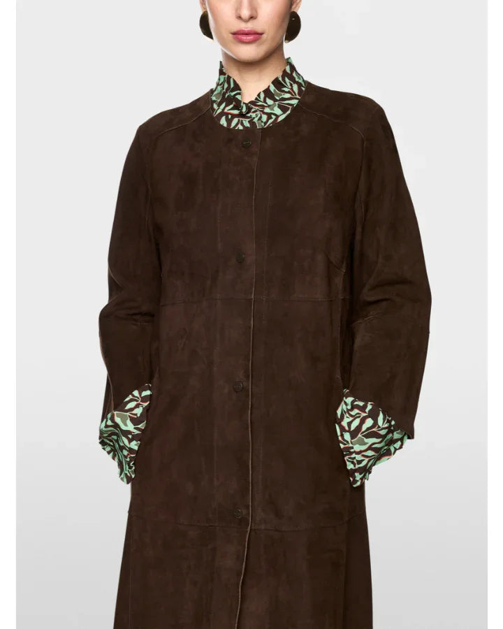 Marc Cain collarless suede coat has a straight cut and is knee length. Its special details include patchwork seams and three-quarter-length sleeves. This elegant coat fastens with press studs.