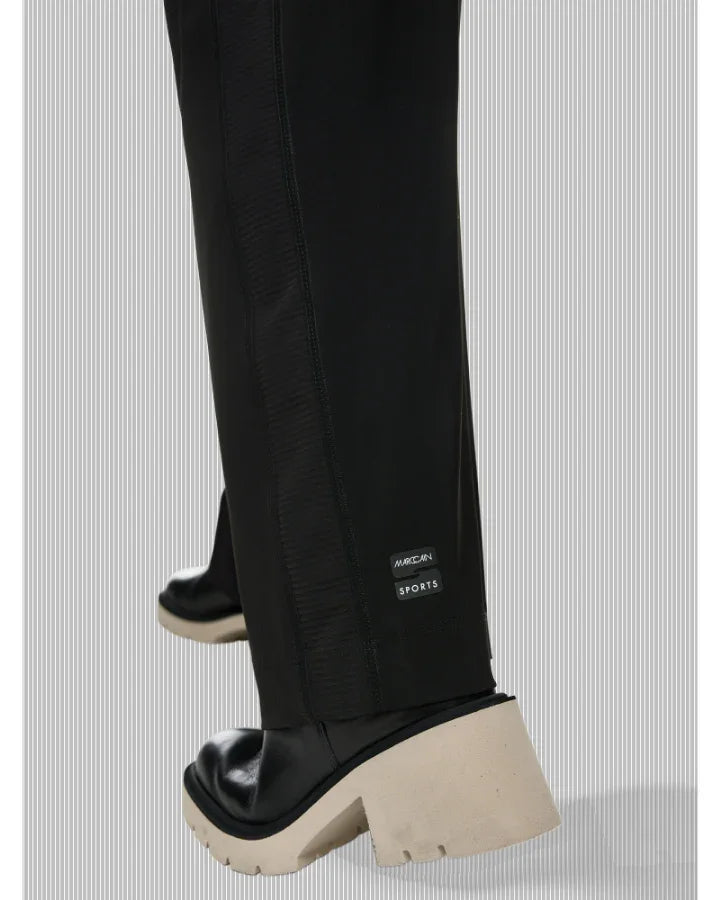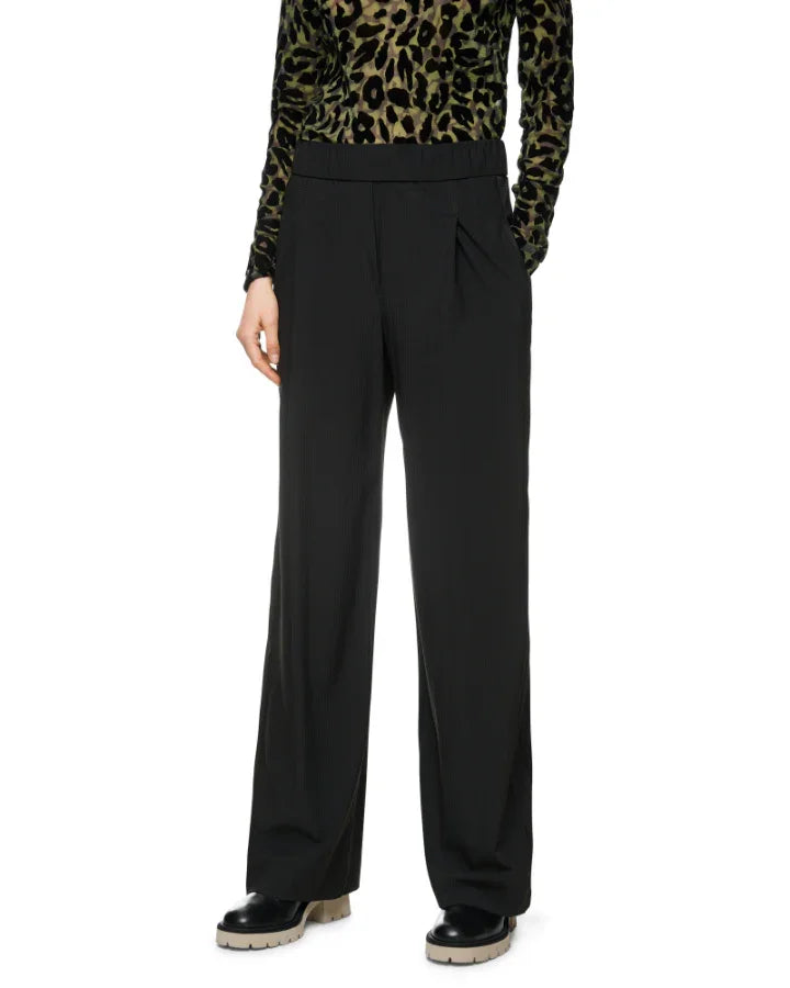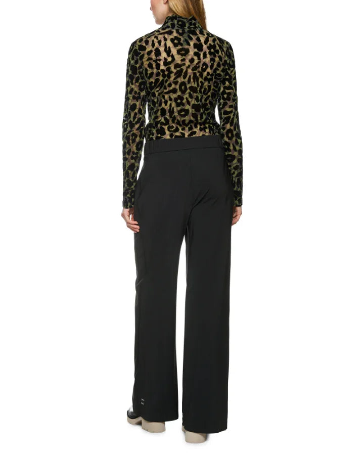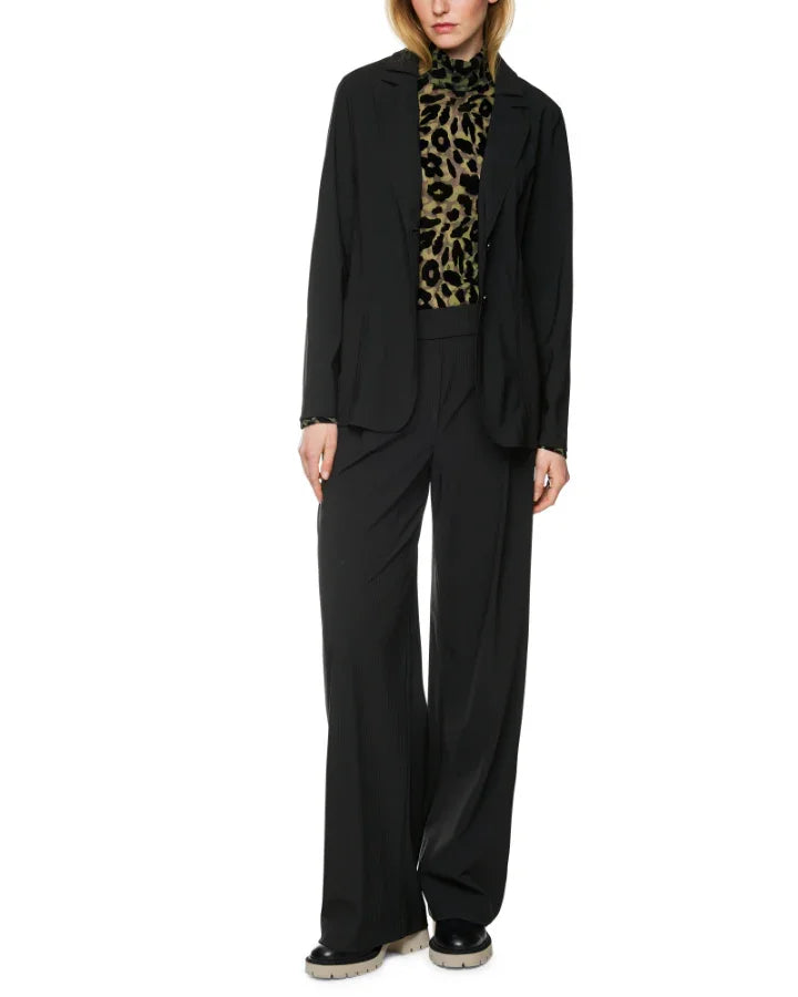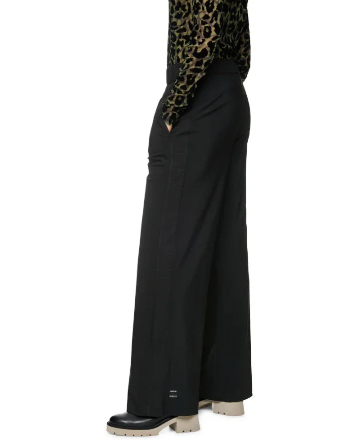 Marc Cain stretch polyamide wide leg pant with eye-catching striped pattern on the front and side pockets. The wide elasticated waistband on these loose-fitting pull-on trousers ensures the perfect fit. Size 3 - Length 34".