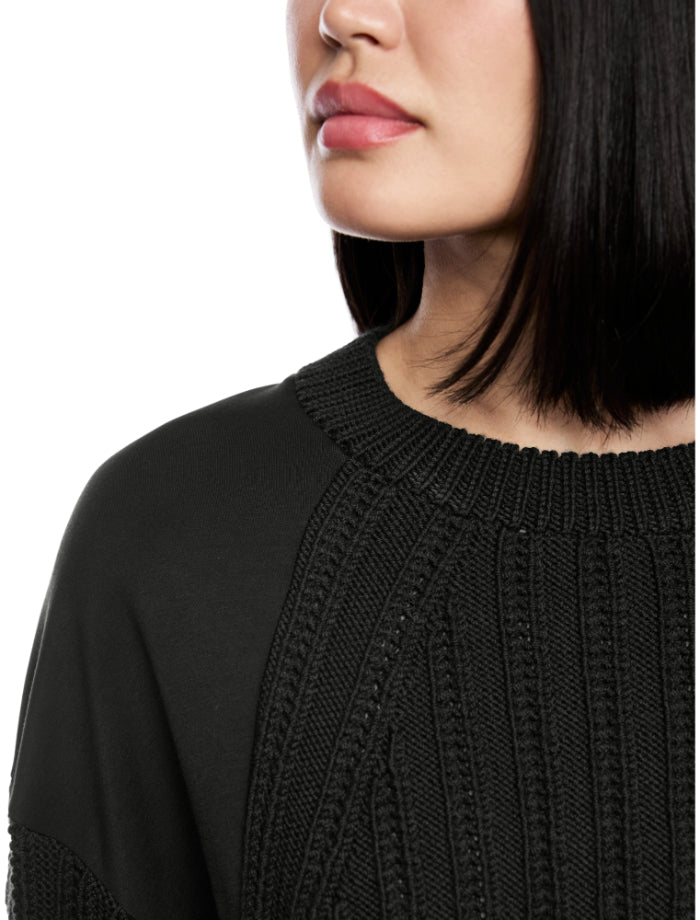 Marc Cain warm knitted pullover made from pure virgin wool with jersey inserts on the shoulders. Unique knit pattern on the front, classic knitted cable pattern on the sleeves.