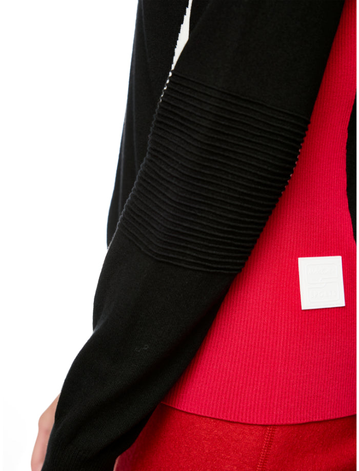 Marc Cain jersey knit pullover in a tailored fit with colour-blocking details on the sides for a modern touch. High-necked collar features a quarter zip opening.