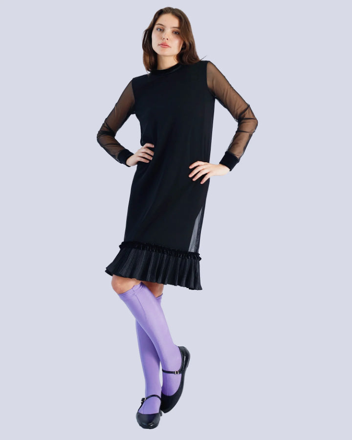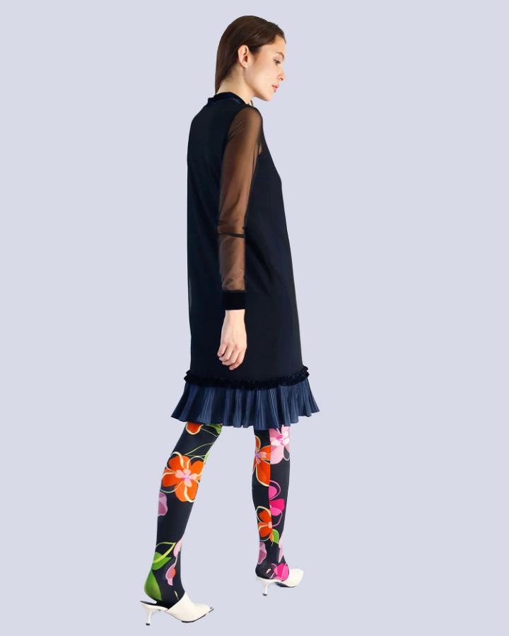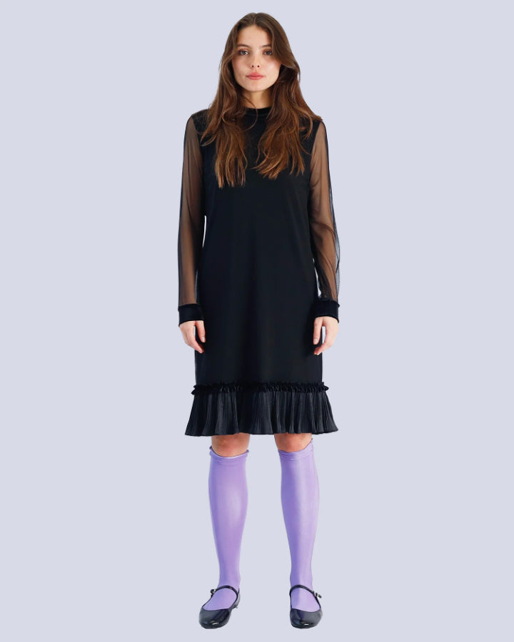 Marie Saint Pierre Mindyre mini dress with a ruffle detailing at the hem. Features long sleeves, a mixed media combination of velvet and mesh, and a high-neck rounded collar.