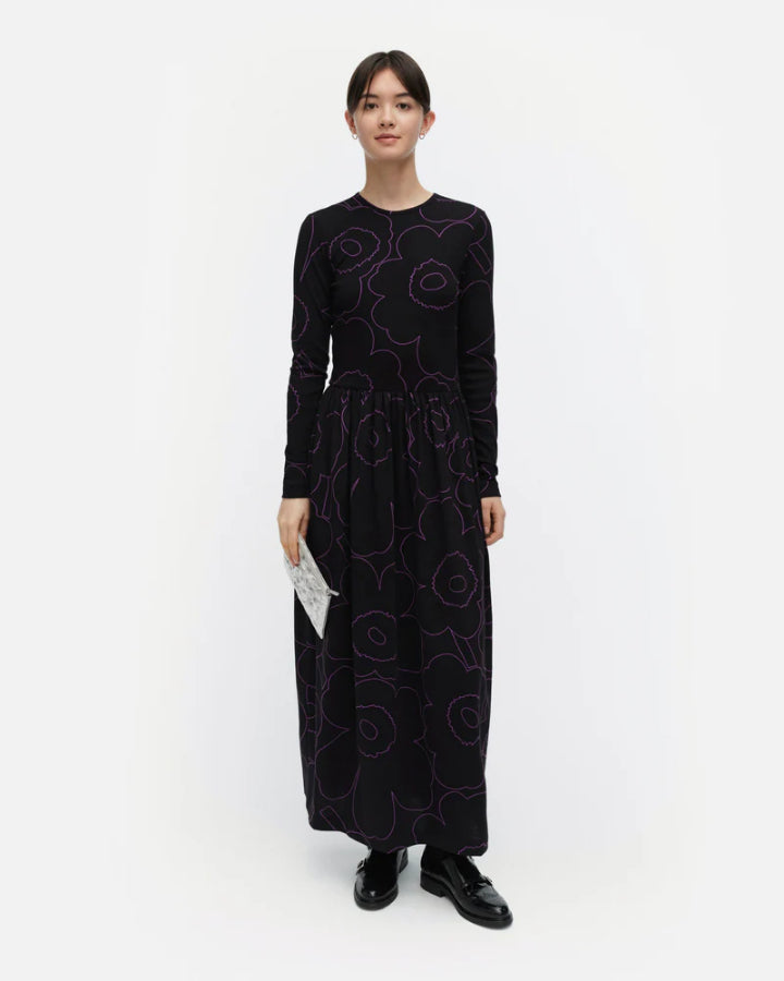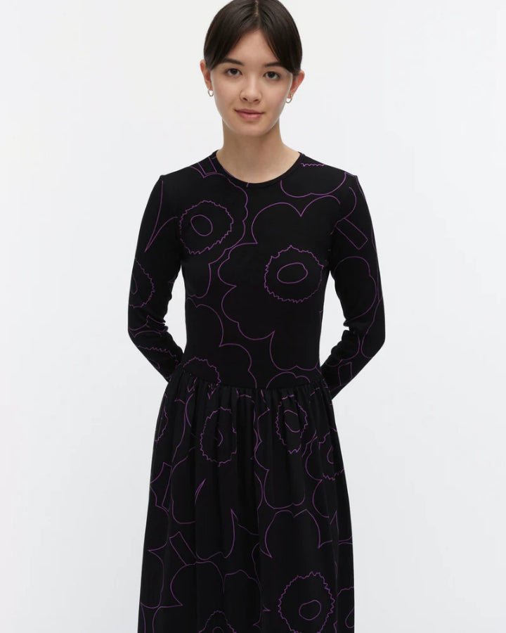 Marimekko skinny fit dress with rib jersey top and a slightly rounded cocoon jersey hem. The dress features the Piirto Unikko pattern, an O-neck with a printed rib, long slim sleeves, and a hem that is gathered at the waistline.