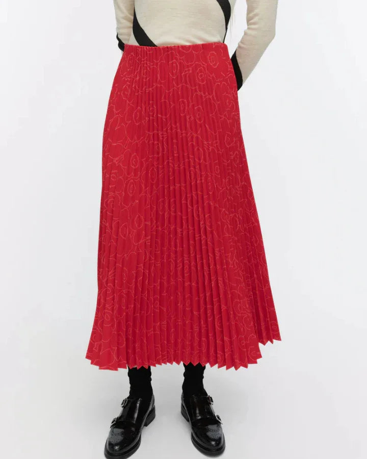 Marimekko relaxed, A-line plisse skirt in the Piirto Unikko pattern with a wide hem and an elastic waistband.