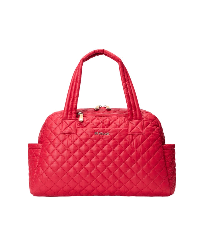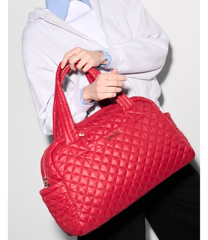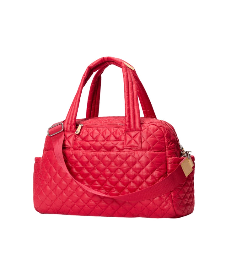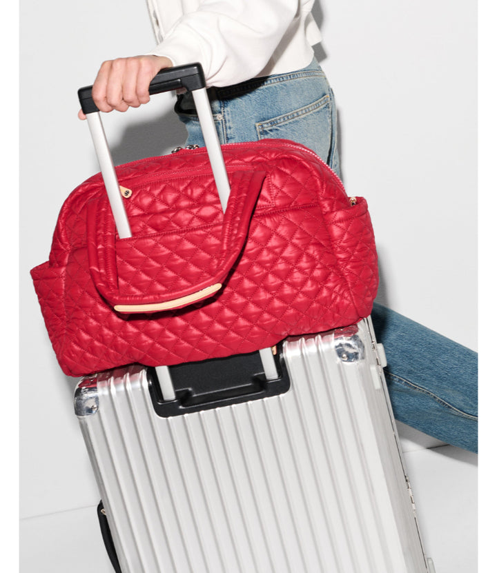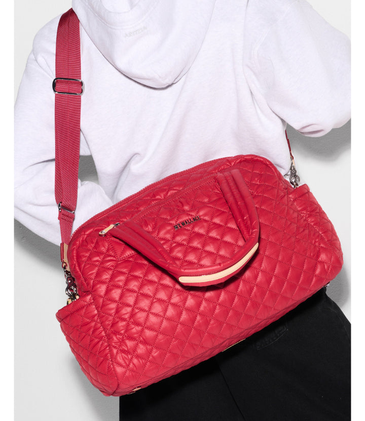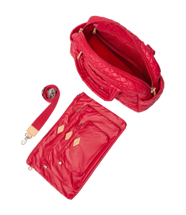 MZ Wallace REC Oxford fabrication Jimmy Deluxe handbag in a limited Apple colourway with silver hardware and a natural Italian leather trim. It features a luggage sleeve, three detachable pouches, seven exterior pockets, a zip top closure, and a detachable, adjustable nylon crossbody bag. Fits a laptop up to 38.1 cm.