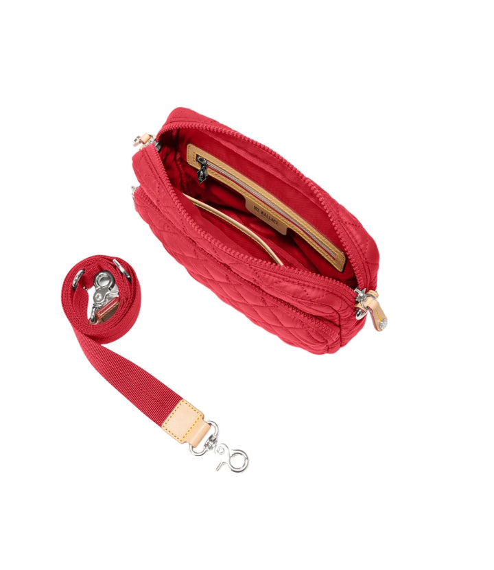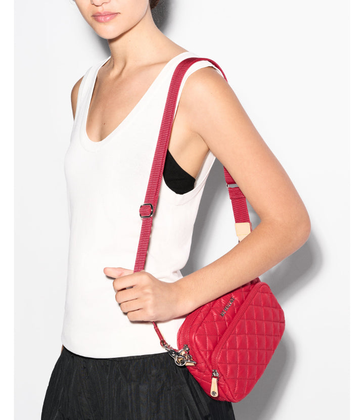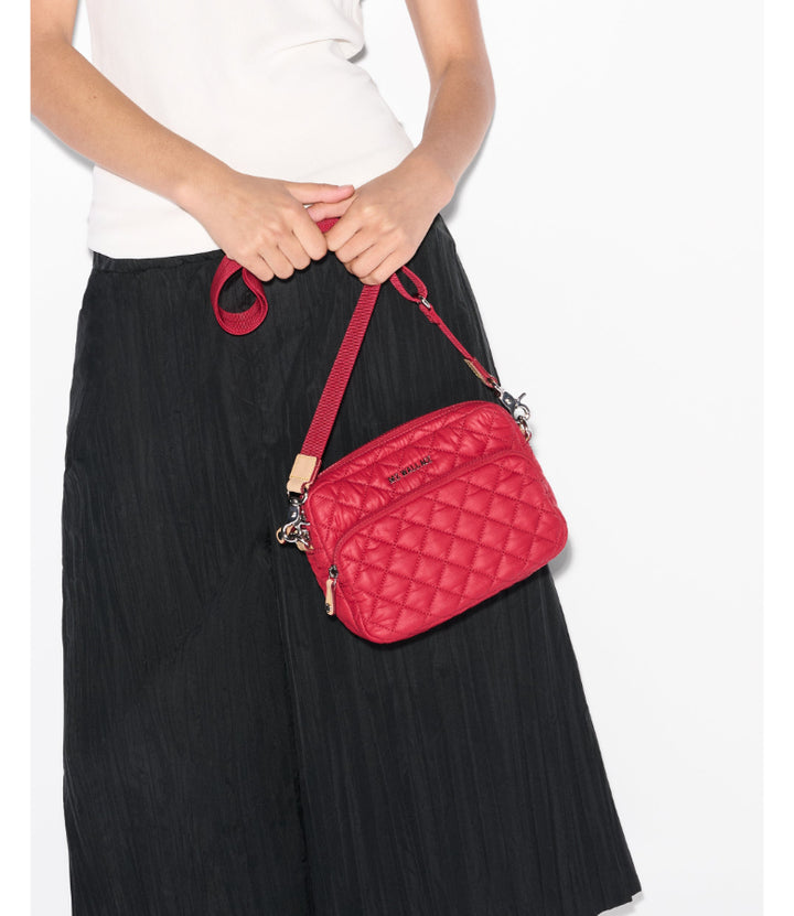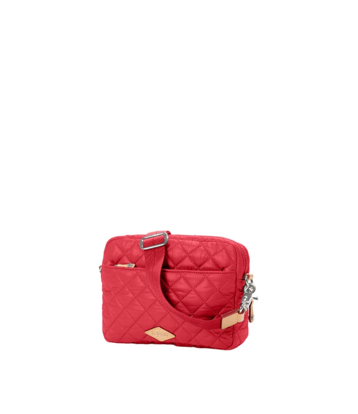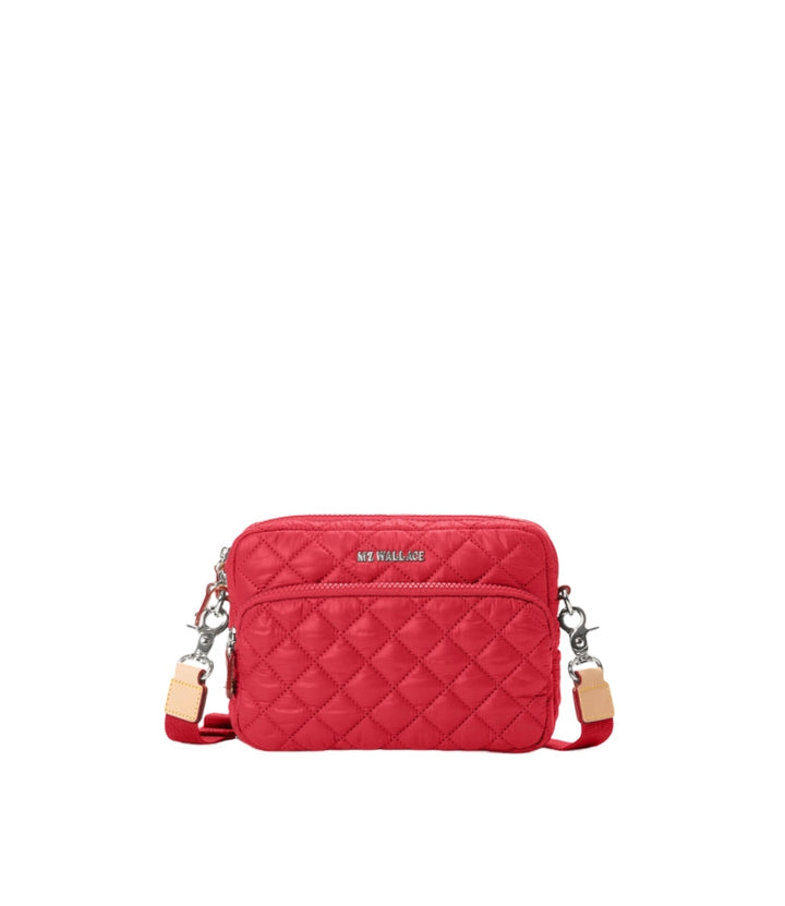 MZ Wallace small metro camera bag in a limited Apple colour, made from a REC Oxford fabric with Italian leather trim and silver hardware. Features a zip top closure, internal and external pockets, and a detachable, adjustable crossbody strap.