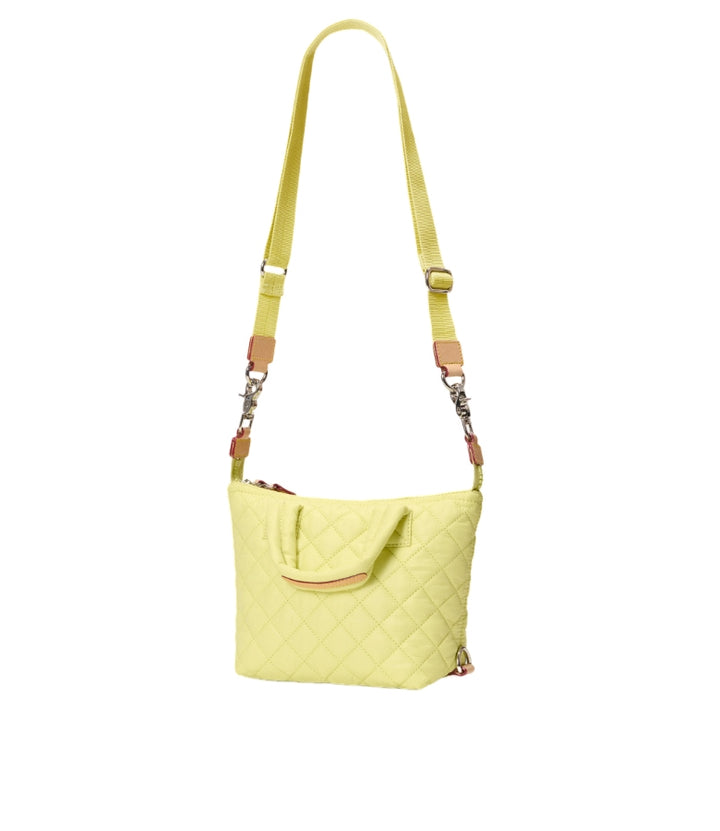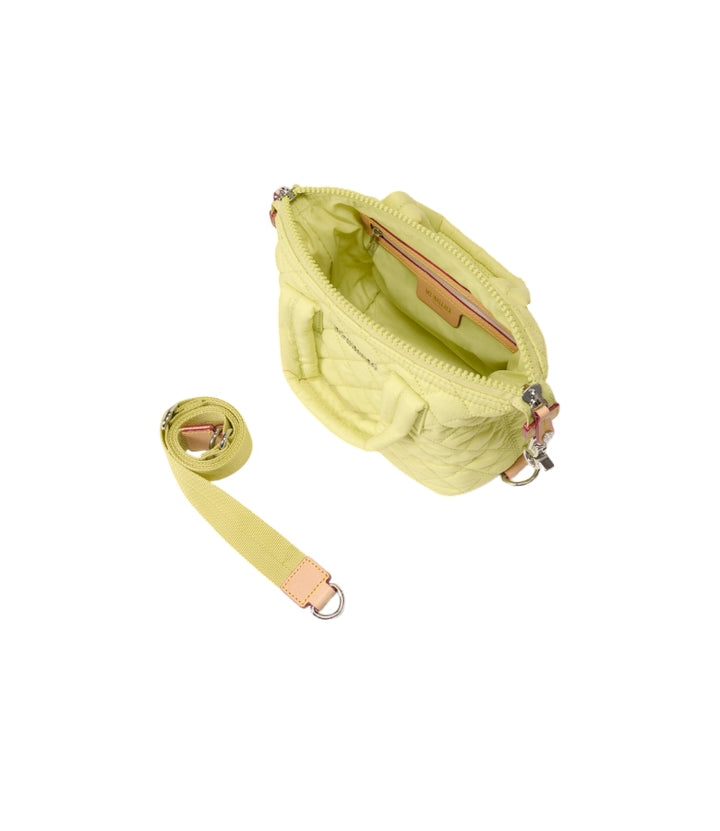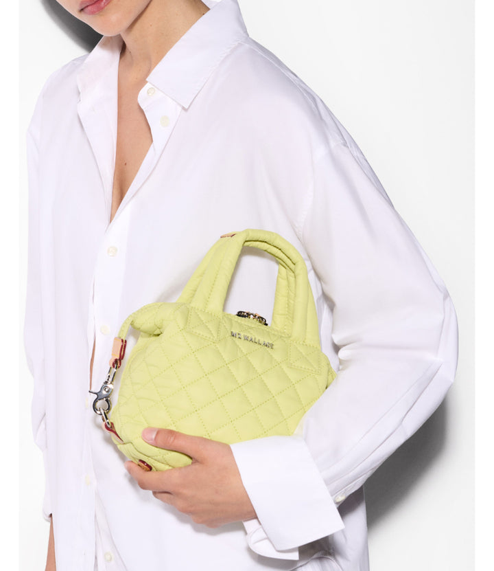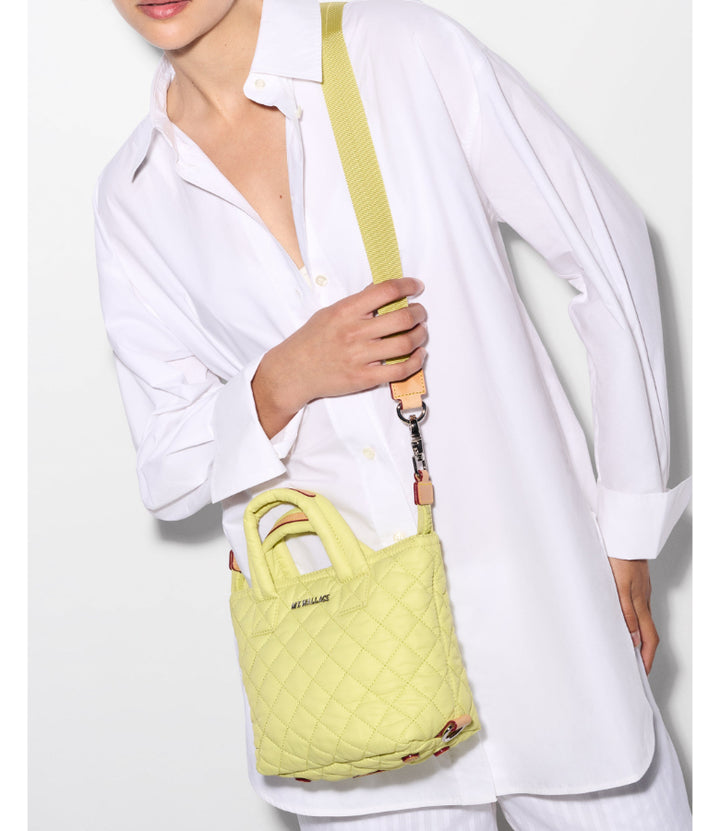 MZ Wallace micro Sutton bag in a limited Celery colourway with silver hardware and green interior lining. Features a zip top closure, a detachable, adjustable nylon crossbody strap, and reinforced, padded nylon handles.