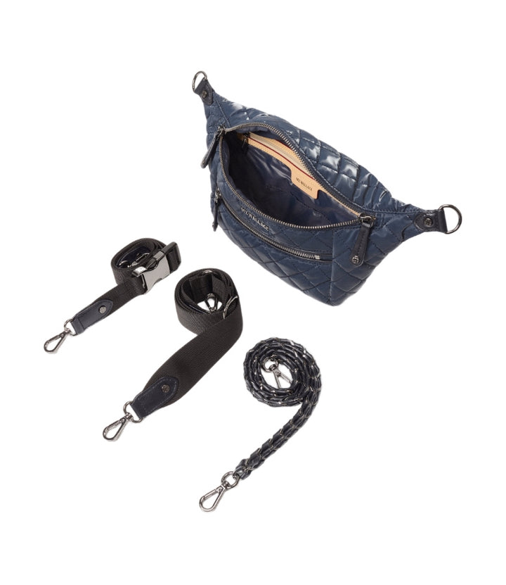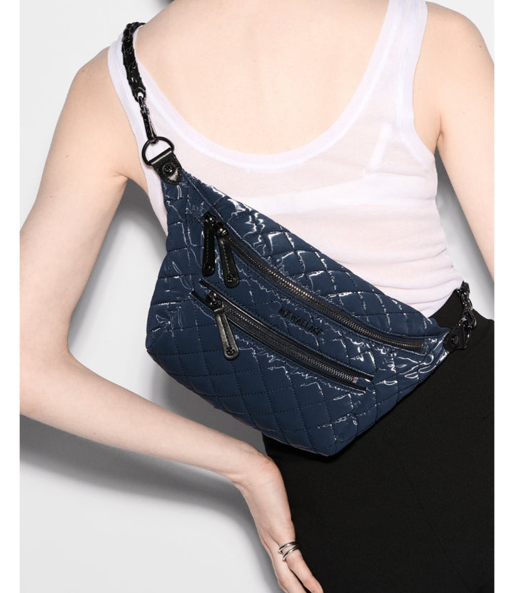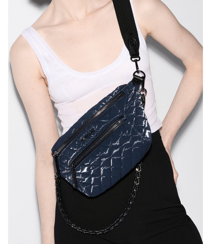 MZ Wallace small Crosby Sling bag in a limited Ink Liquid colourway with gunmetal hardware and a blue interior lining. features a detachable, adjustable nylon crossbody strap, a waist strap, and a chain strap. Zip top closure.