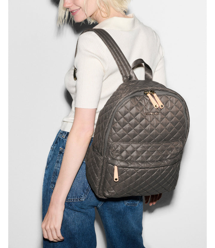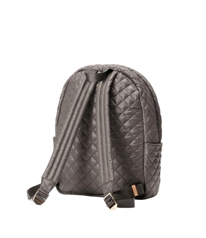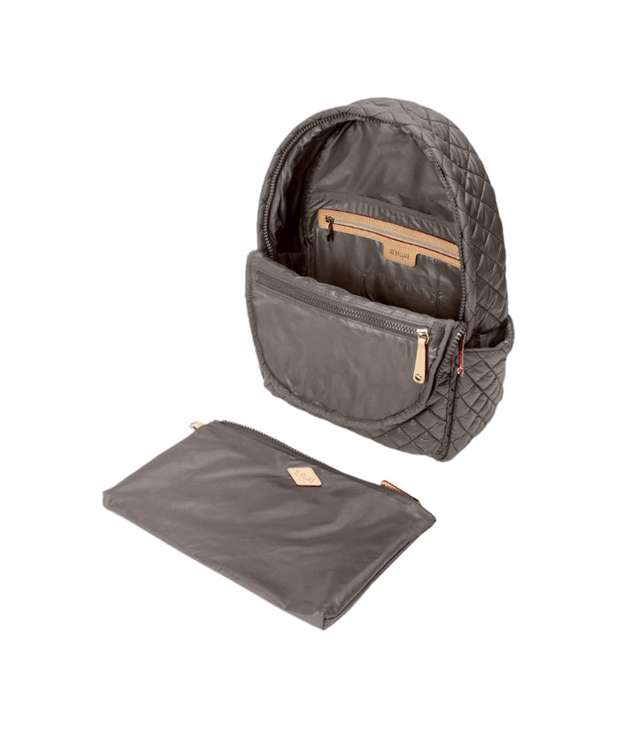 MZ Wallace City Metro backpack in a limited Magnet colourway with gold hardware and grey interior lining. Features one detachable pouch, three exterior pockets, a phone pocket, a keychain holder, and a zip top closure. Fits a laptop up to 33.0 cm.