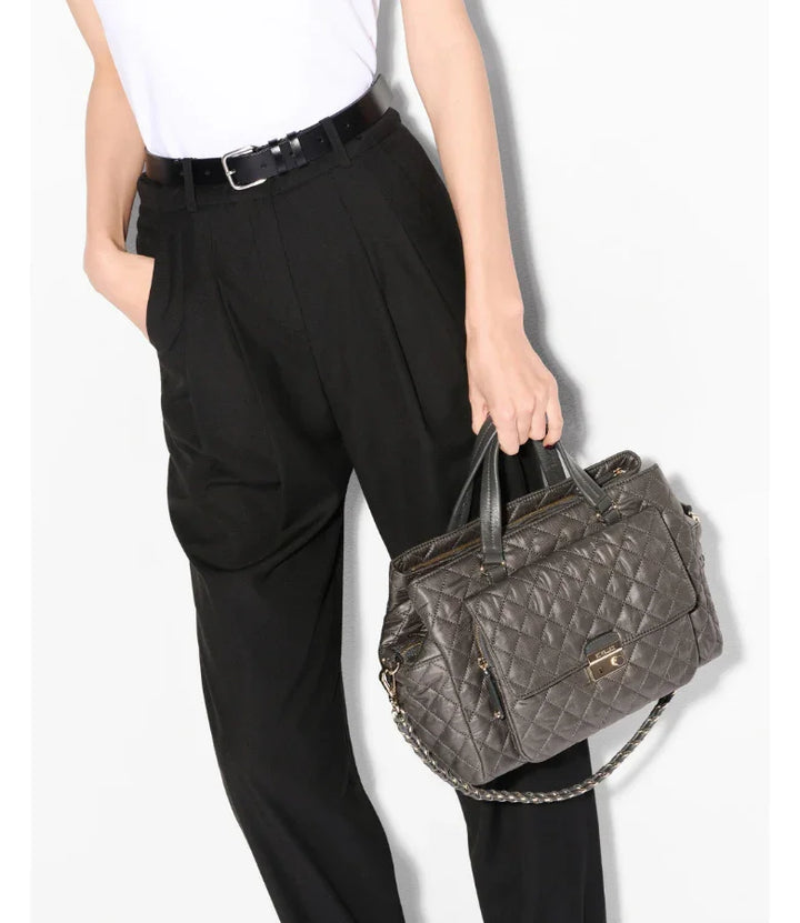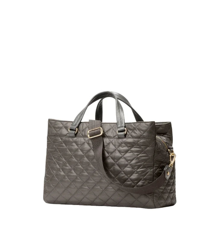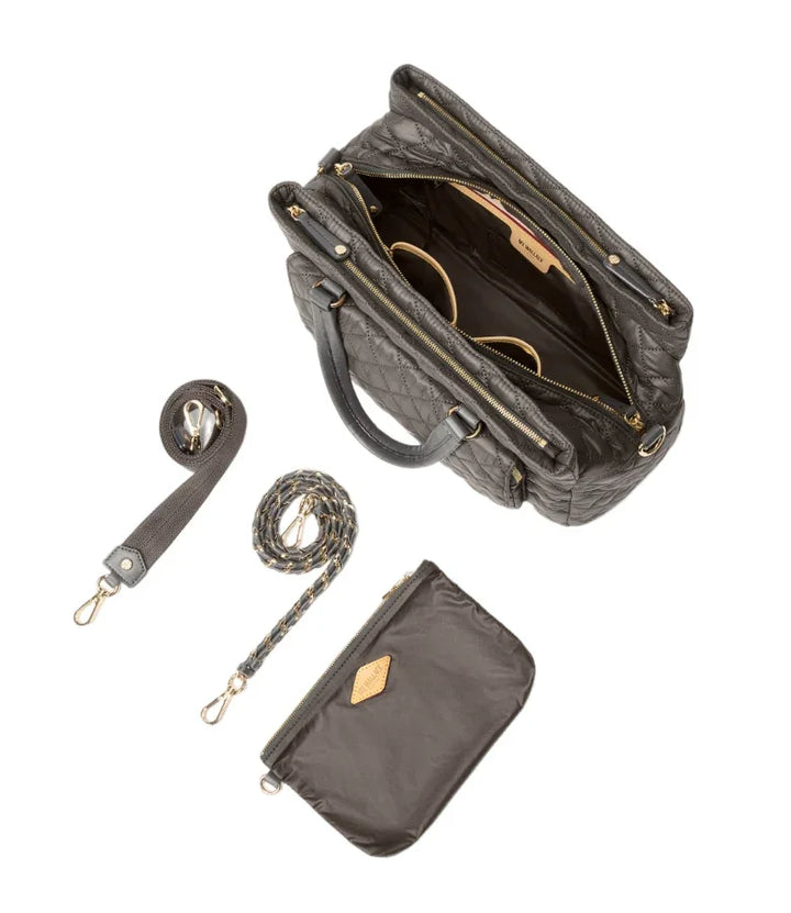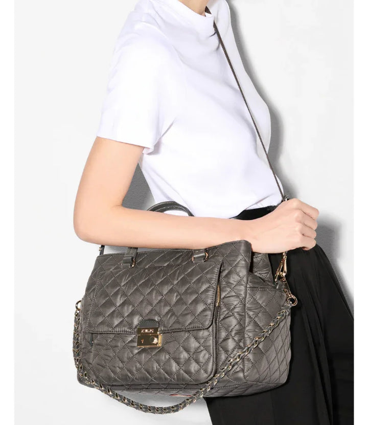 MZ Wallace satchel with a grey interior lining and gold hardware which includes a lock at the front. Features one detachable pouch, three exterior pockets, two detachable straps in nylon and chain, a phone pocket, and a zip top closure.