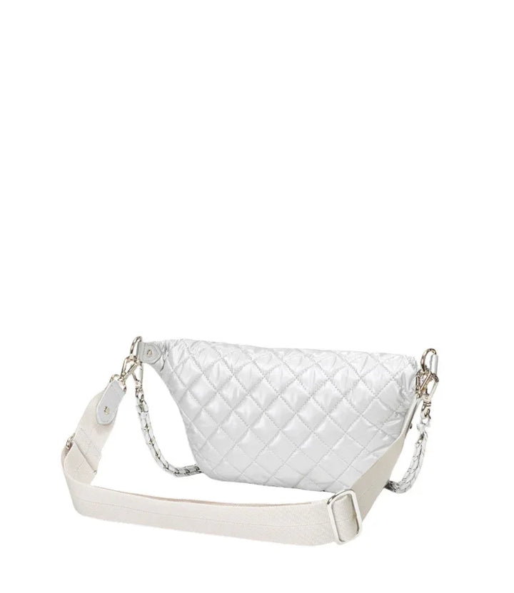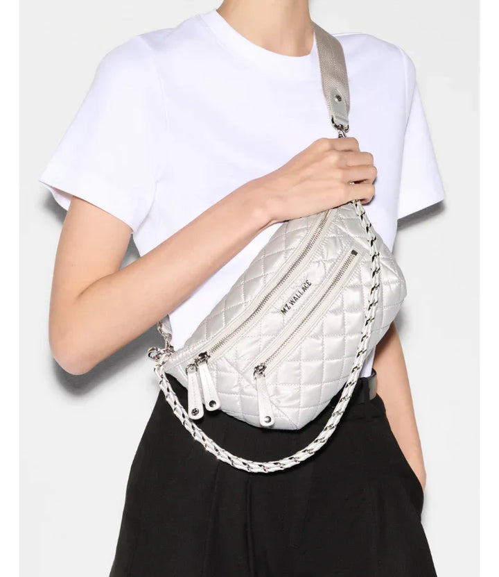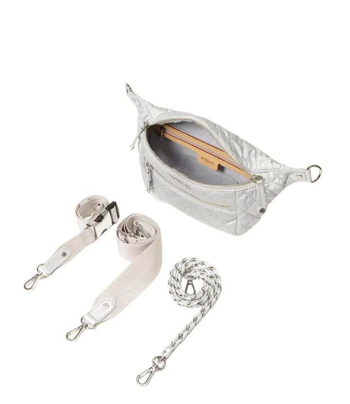 MZ Wallace small Crosby crossbody sling in a limited Oyster metallic colourway with a grey lining and silver hardware. Features an exterior pocket, a zip top closure, and three additional straps: nylon crossbody, waist strap, and a chain strap.