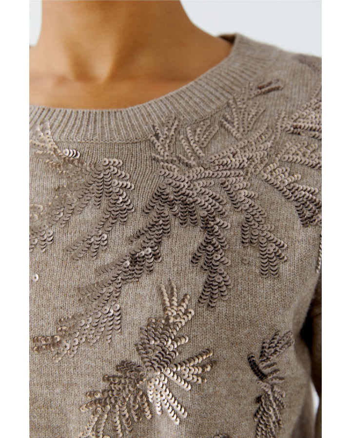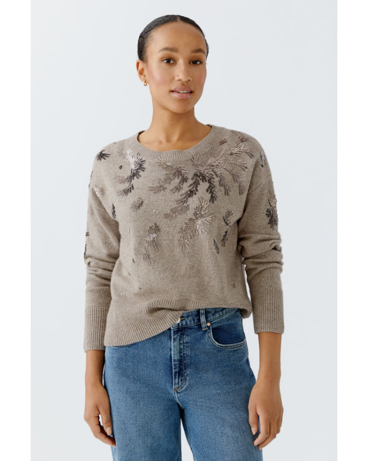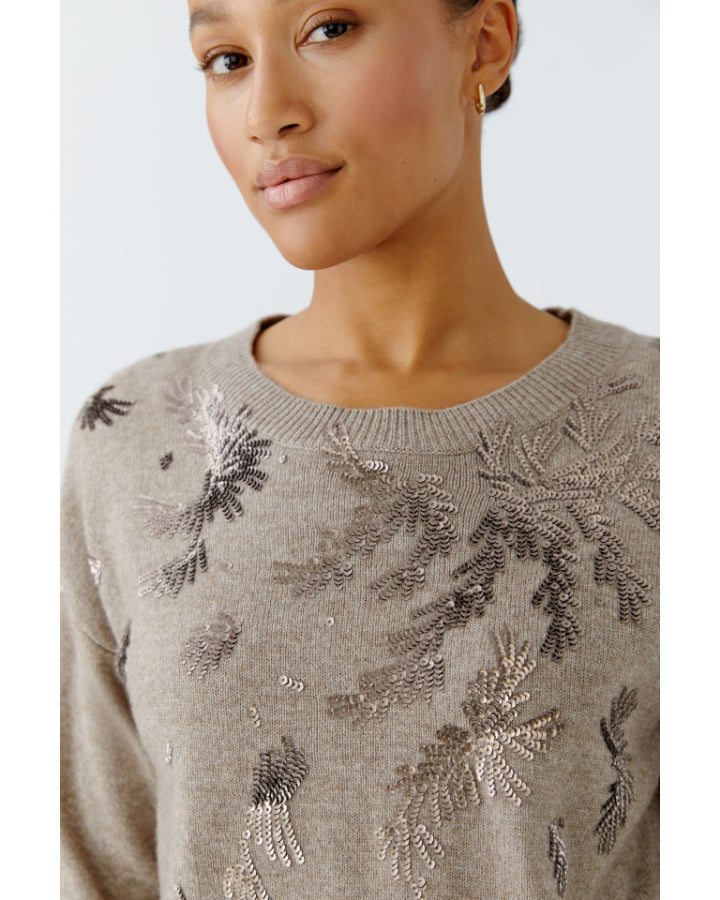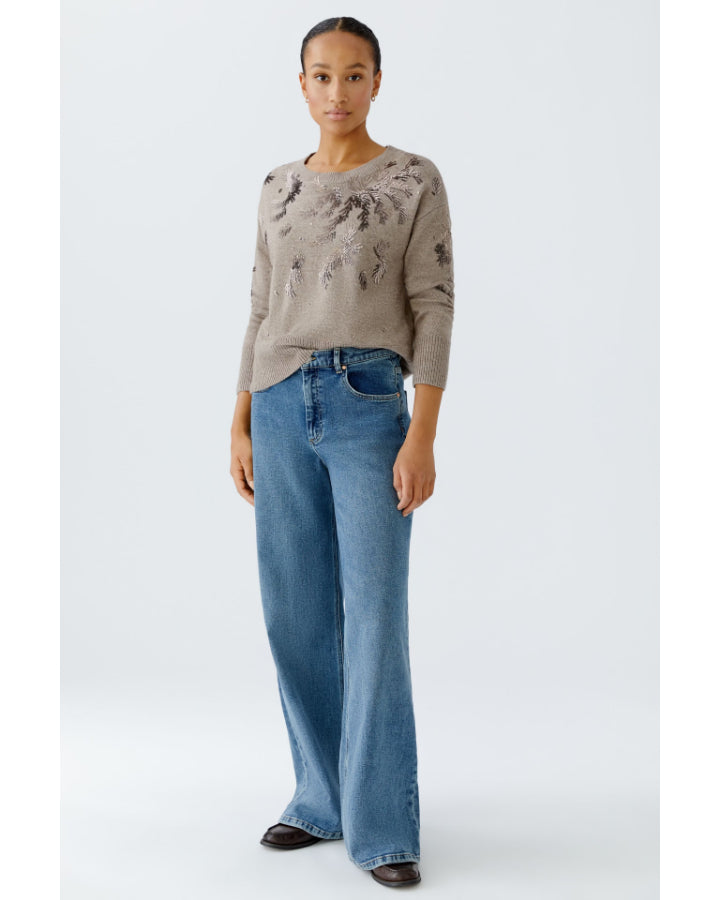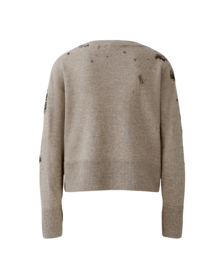 Oui casual cut, cropped length soft wool blend knit sweater with placed sequin motifs on the front and sleeves. Features crew neck, dropped shoulders falls loosely to the long sleeve and distinctive ribbed cuffs at the sleeve and hem. Size 36 - Length 52cm.