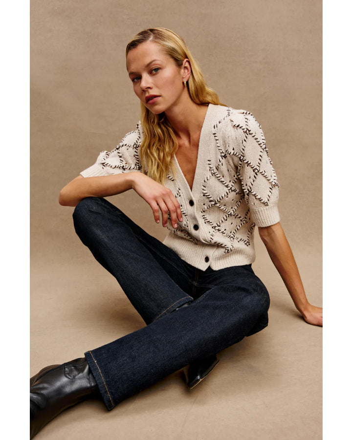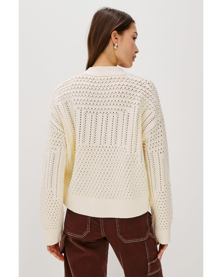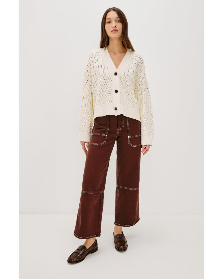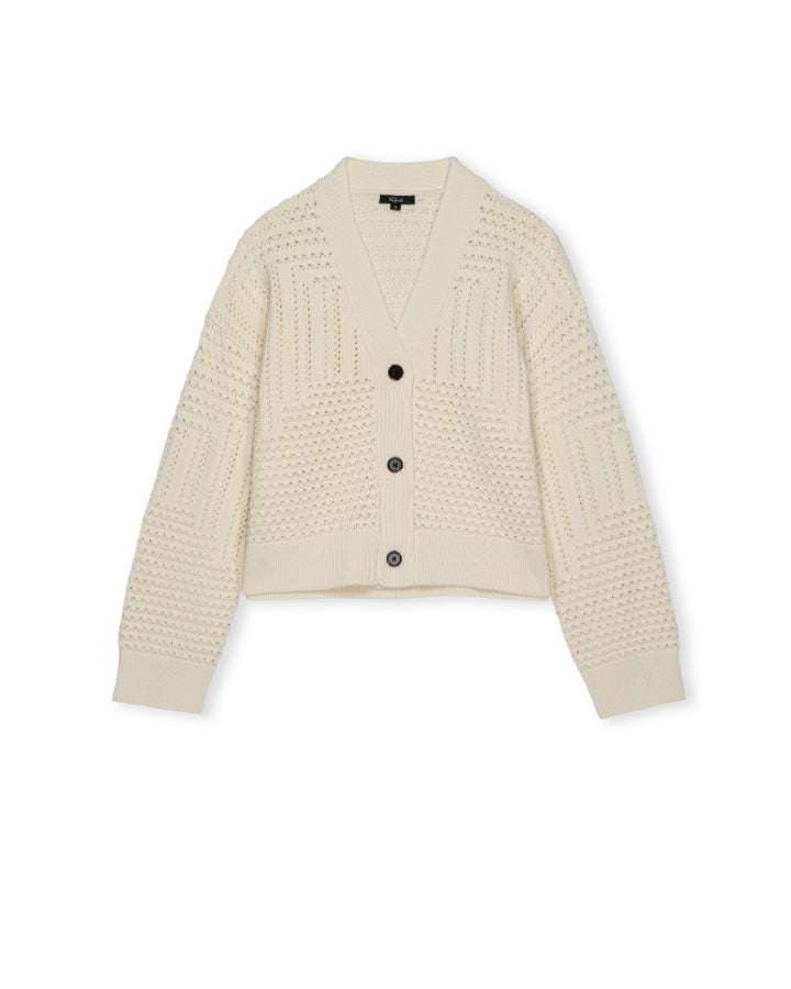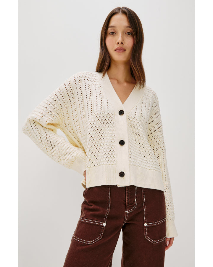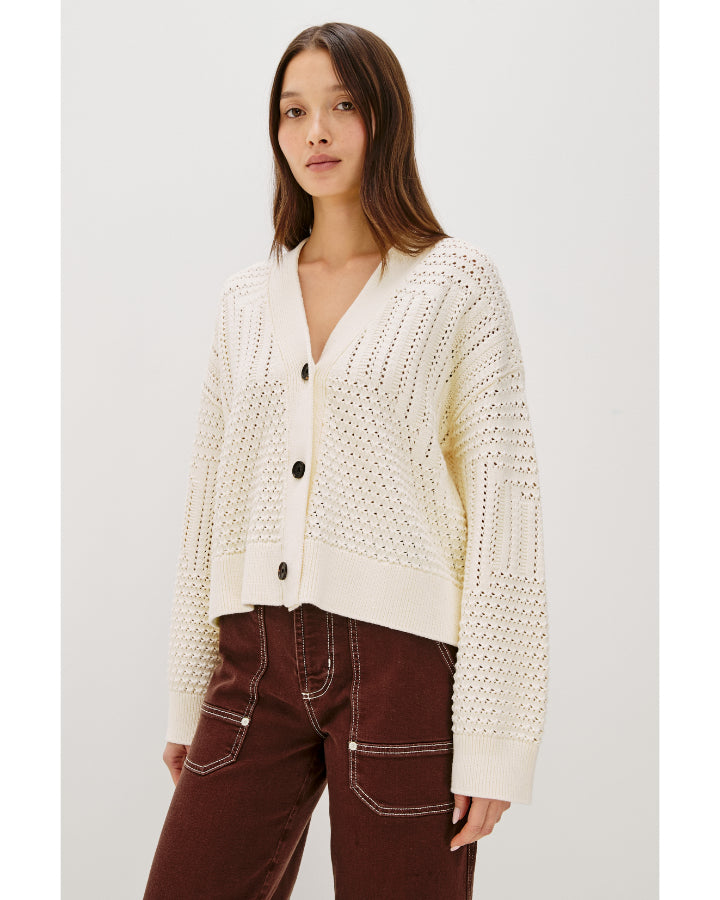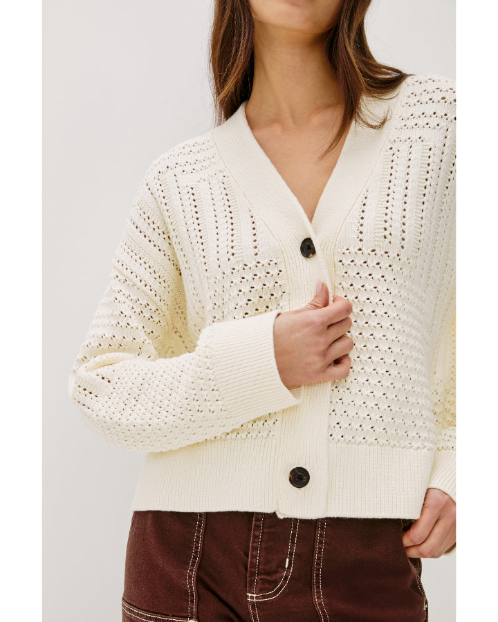 Rails relaxed fit cotton classic academia-style cardigan with patchwork pointelle details for a distinctive touch, drop shoulders, ribbed trims and button front closure. Size S - Length 21".