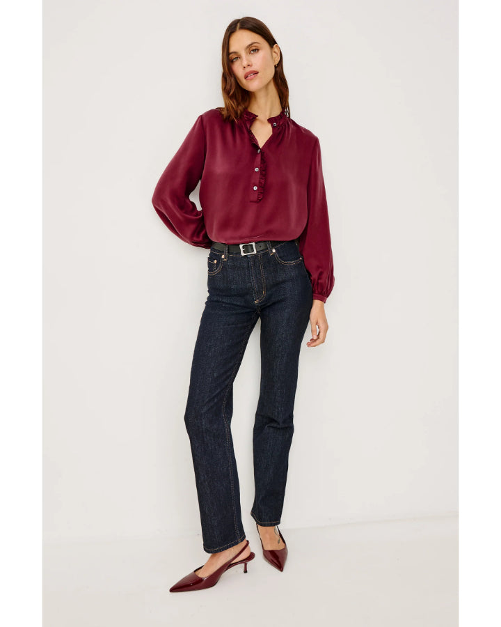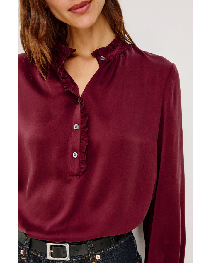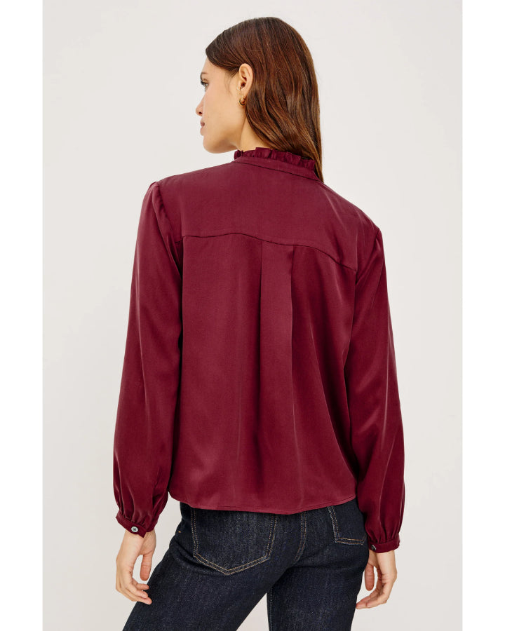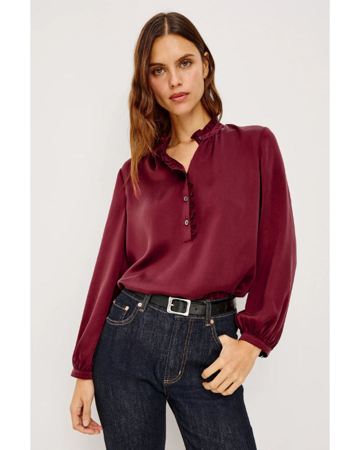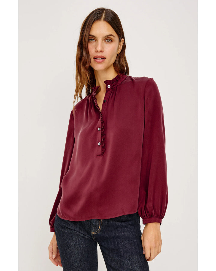Rails flowing silhouette, luxurious silk charmeuse blouse features a ruffled high neckline, classic button placket, and billowing sleeves gathered at fitted cuffs for a polished finish. Size S - Length 24".
