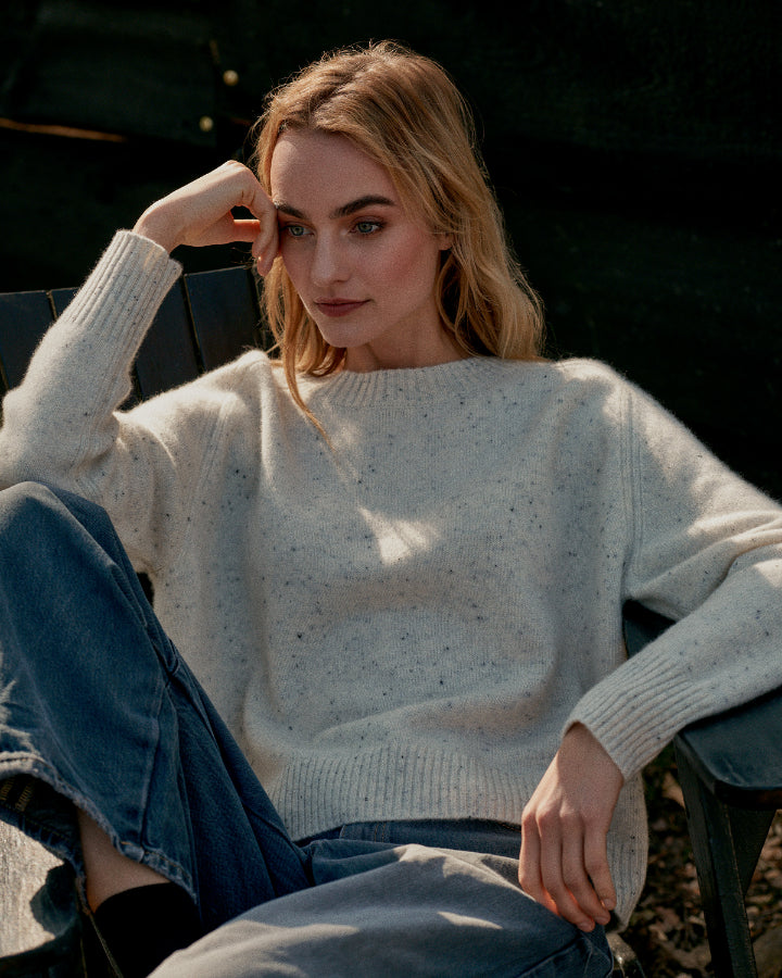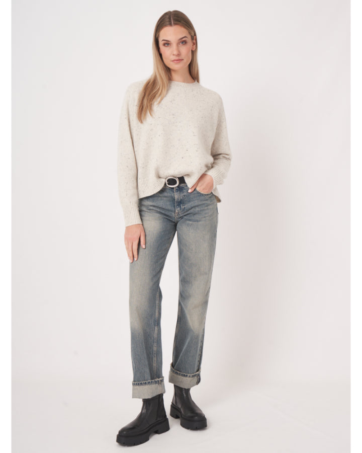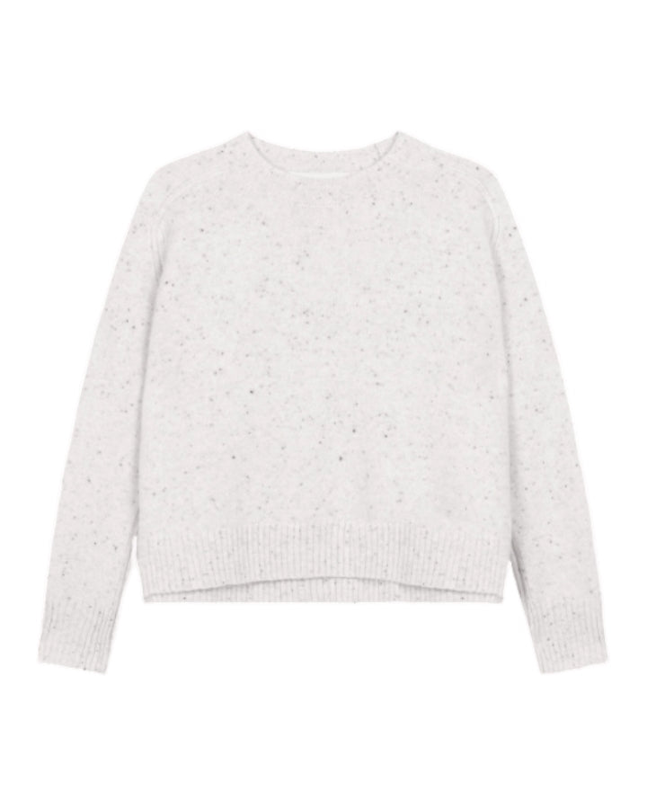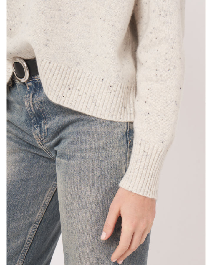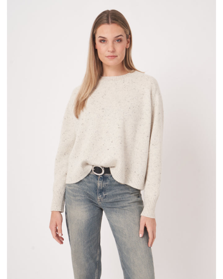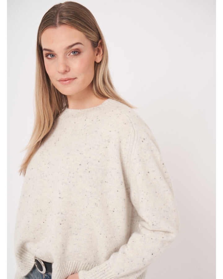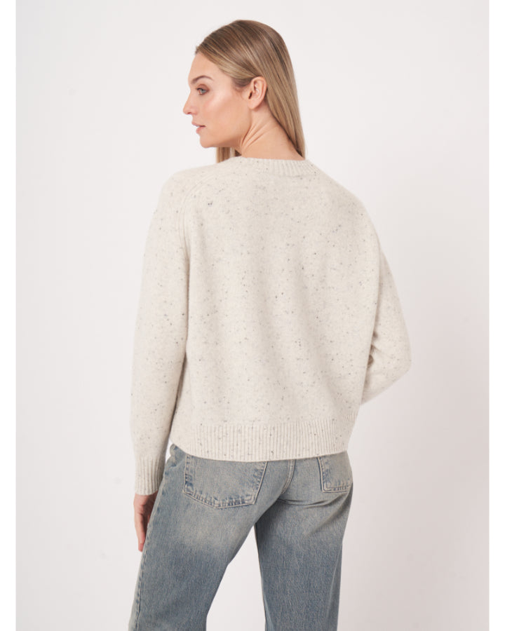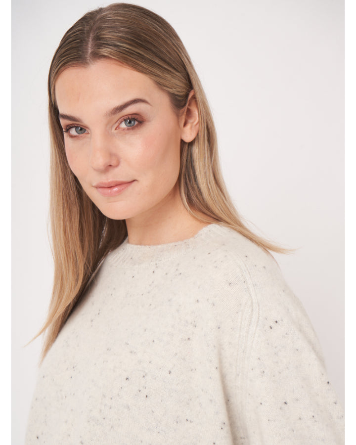 Repeat casual fit, medium weight cashmere fine dotted pattern tweed yarn sweater with round neck, long sleeves and ribbed trims. Size S - Length 56cm.