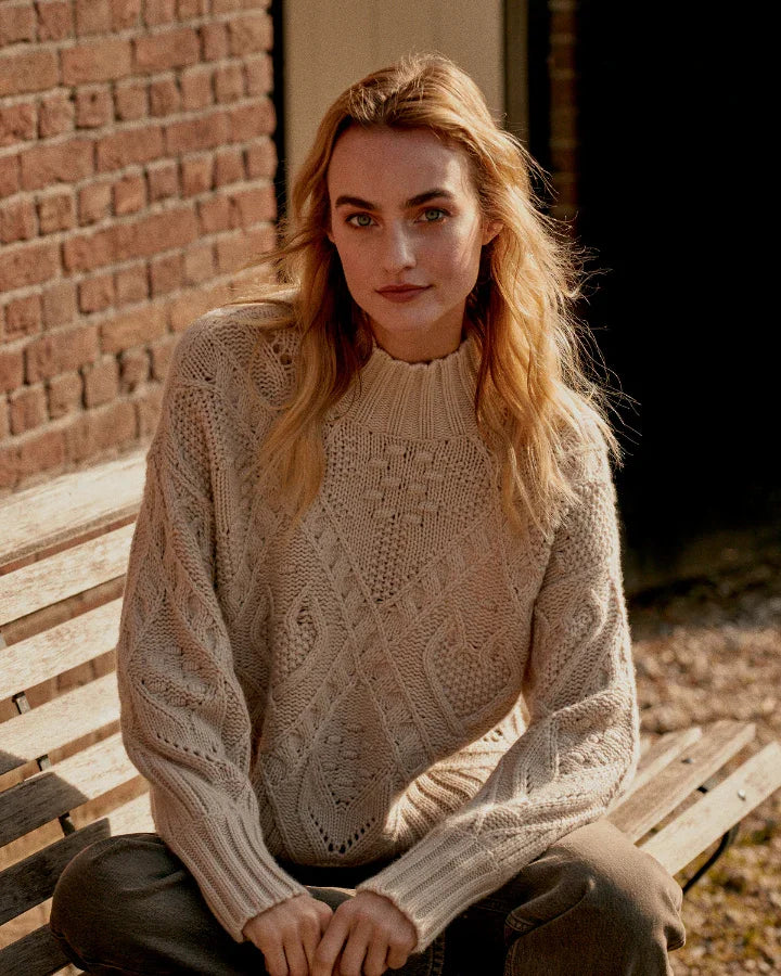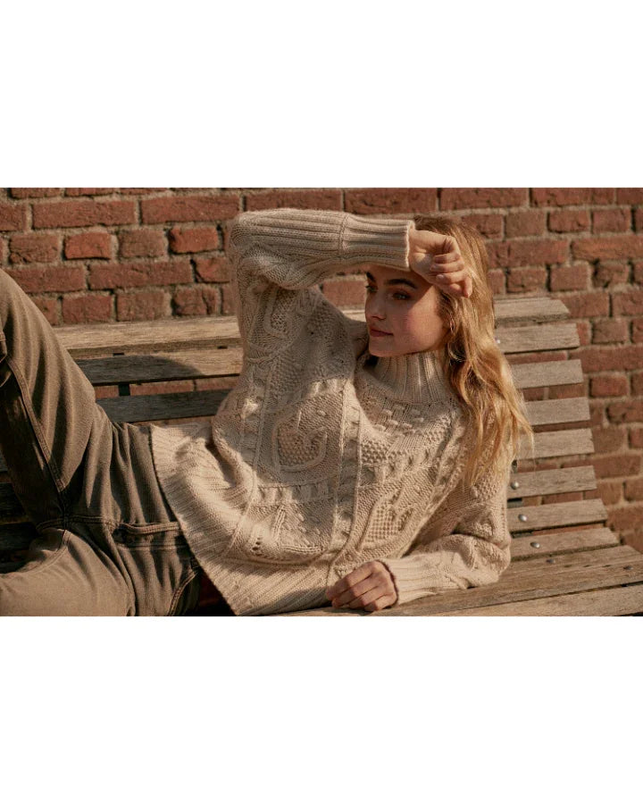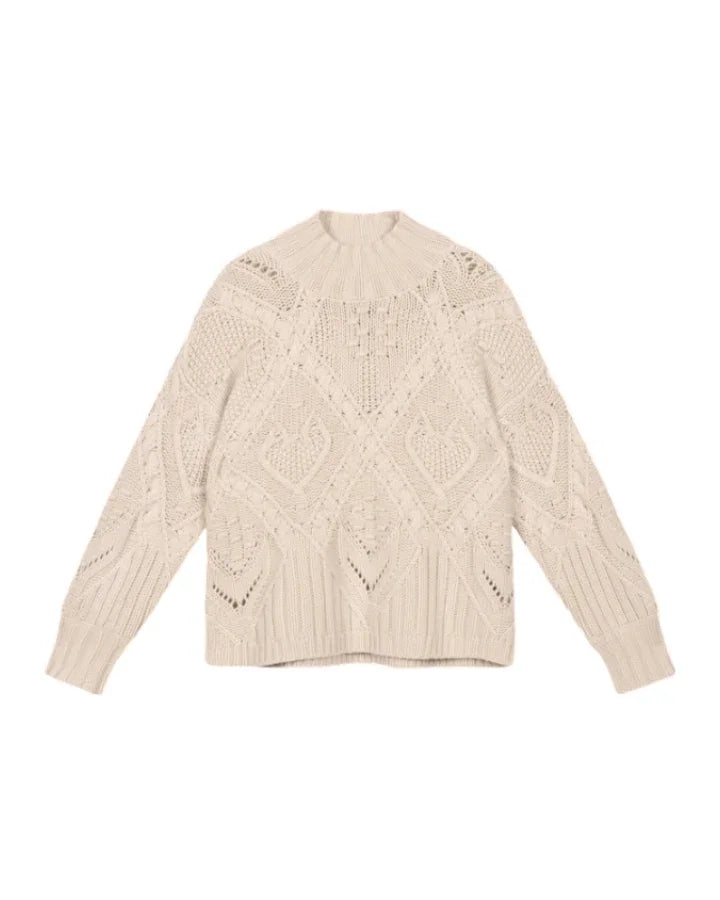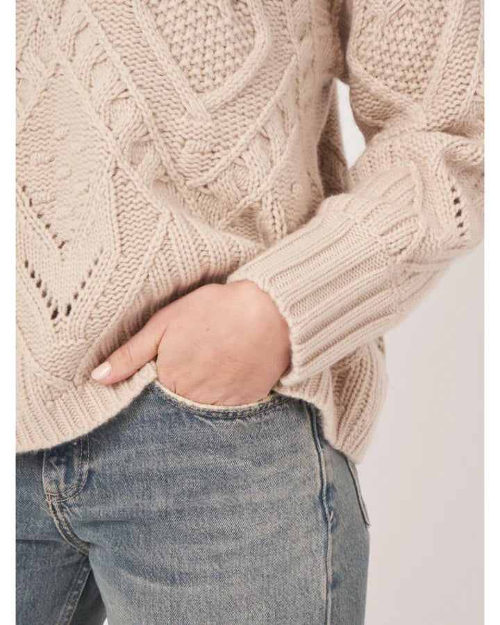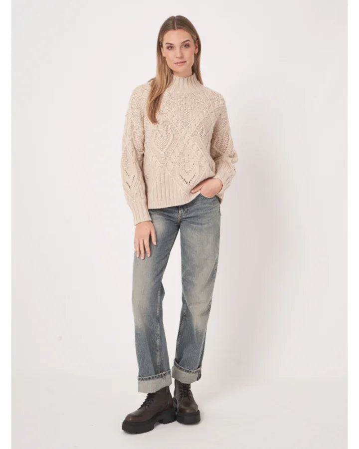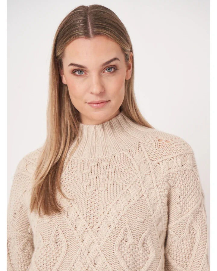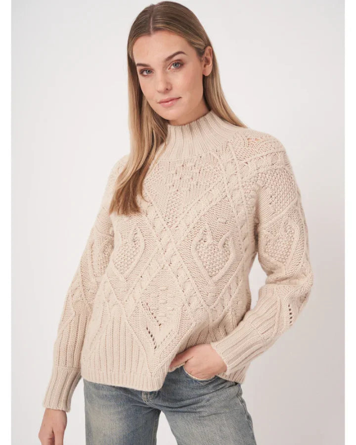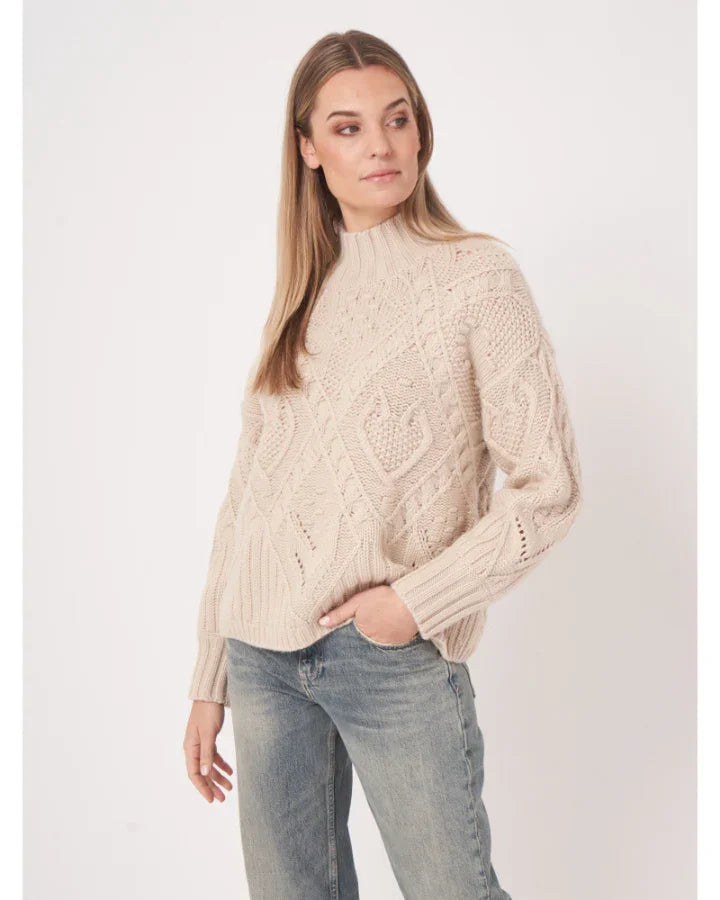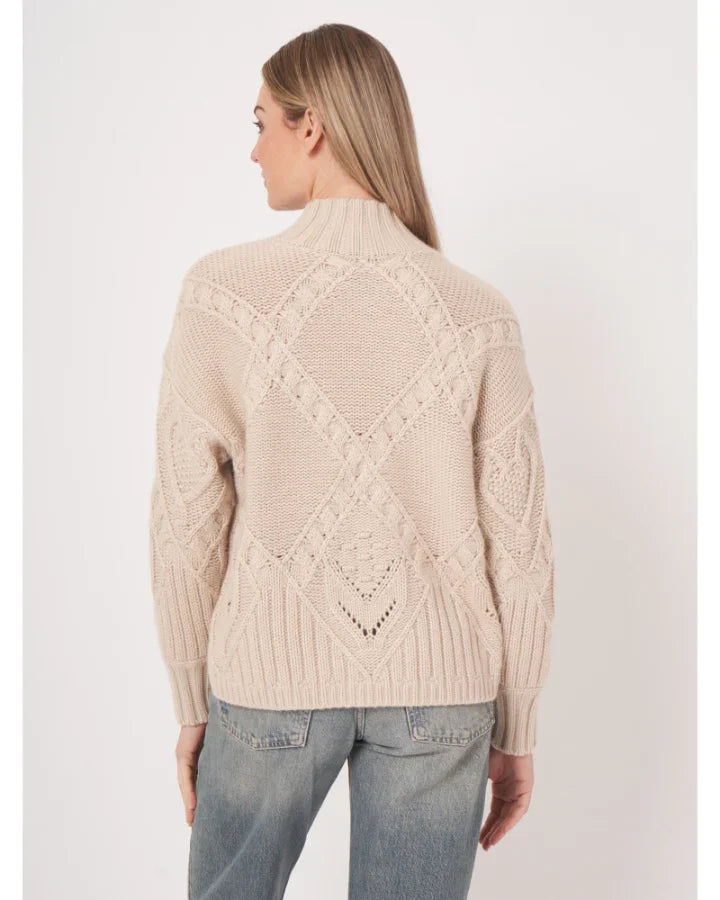 Repeat wool cashmere chunky patterned knit sweater with a wide ribbed high neck, ribbed cuffs and hem.