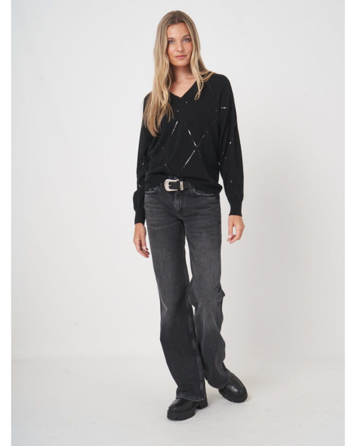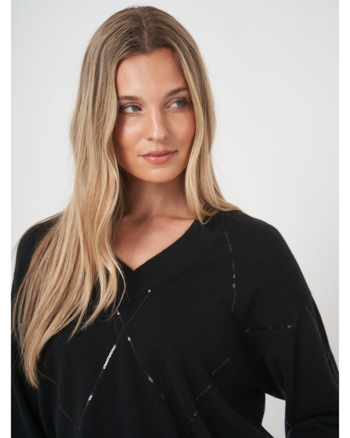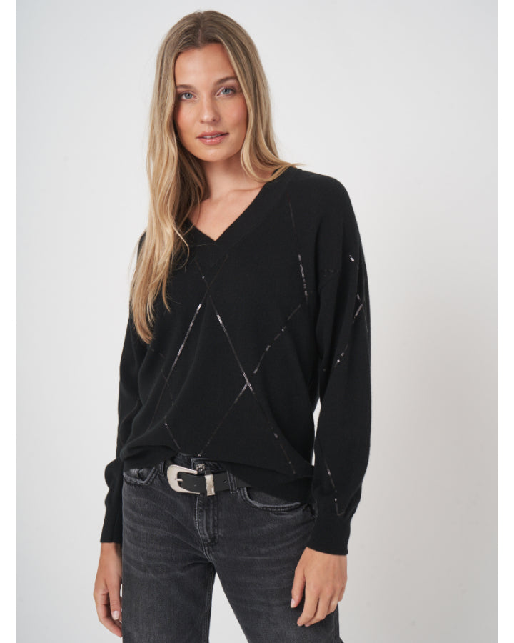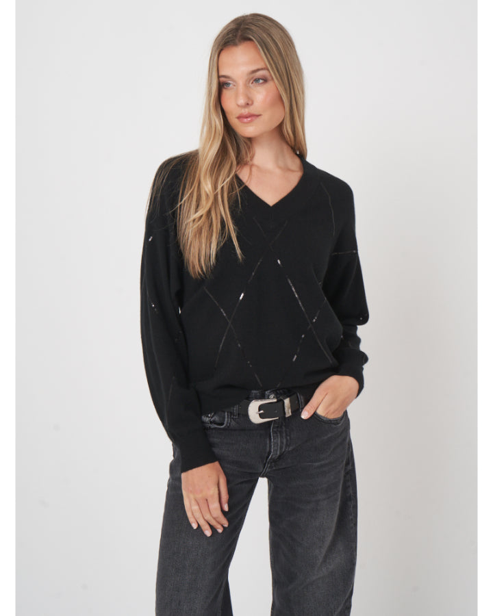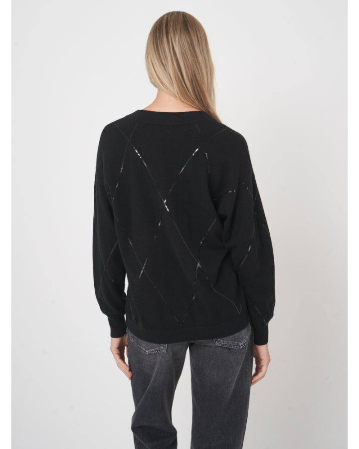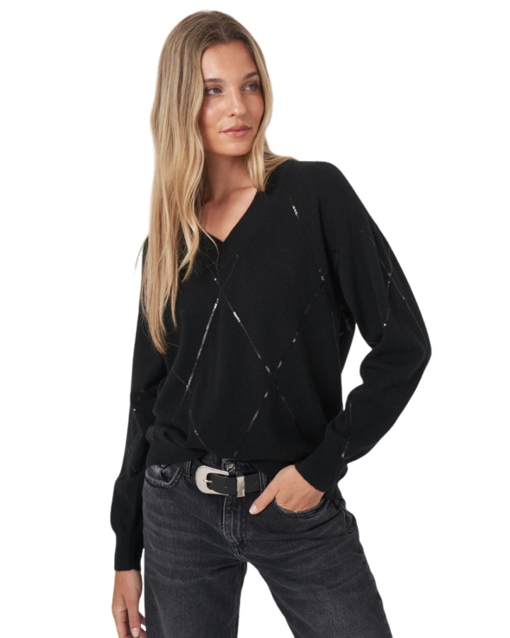 Repeat lightweight, fine knit V-neck sweater features all over sequin diamond pattern, long sleeves and ribbed trims.