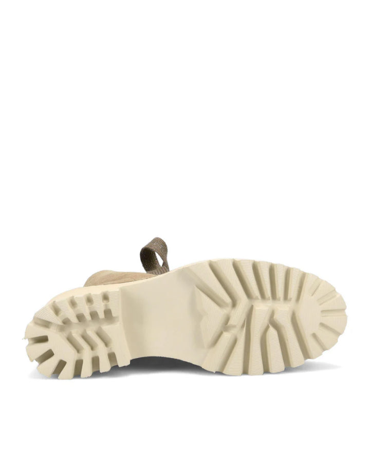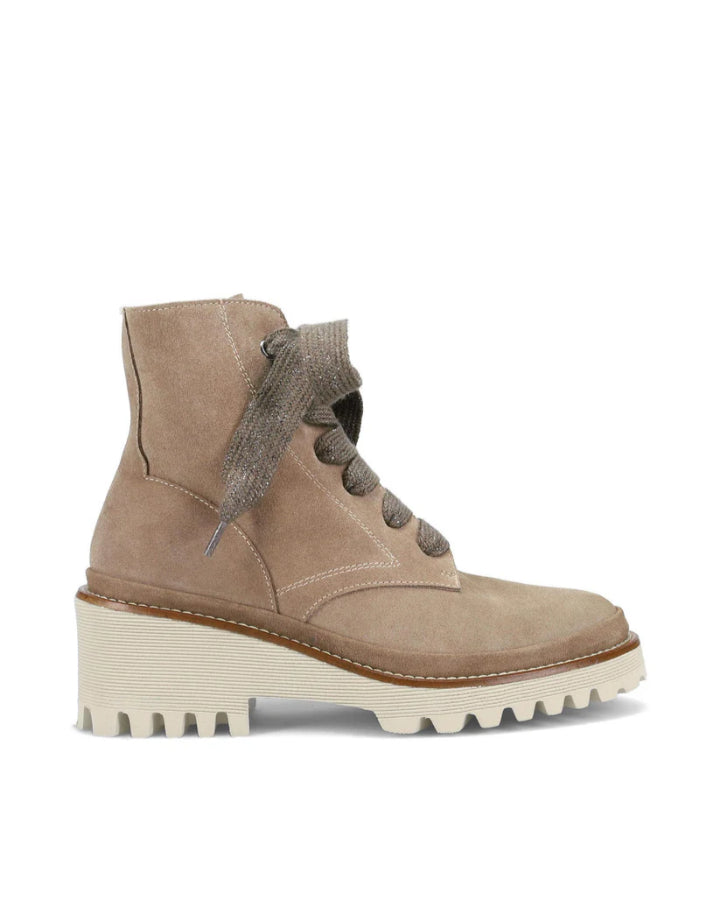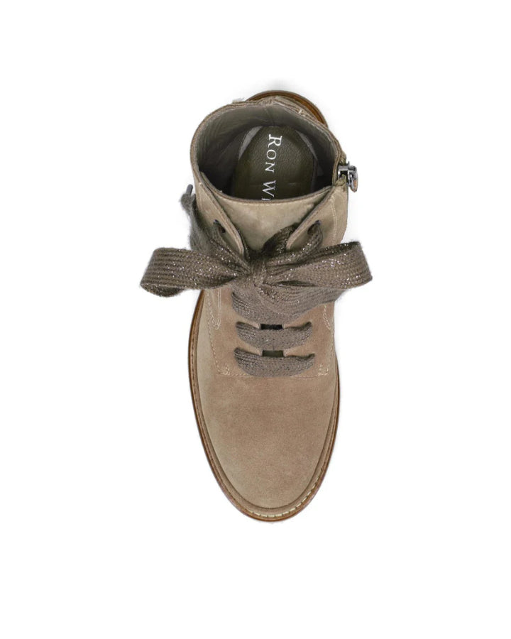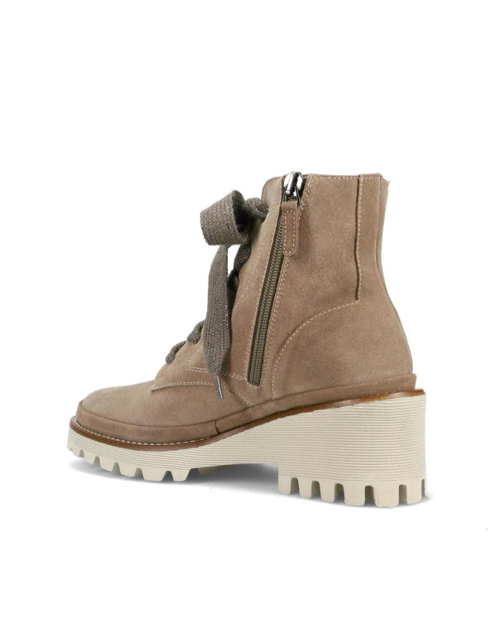 Ron White weatherproof suede ankle boot with inside zipper, sweater laces and lug wedge sole. Heel 2" with 3/4" platform, Shaft Height 5", Shaft Circumference 12".