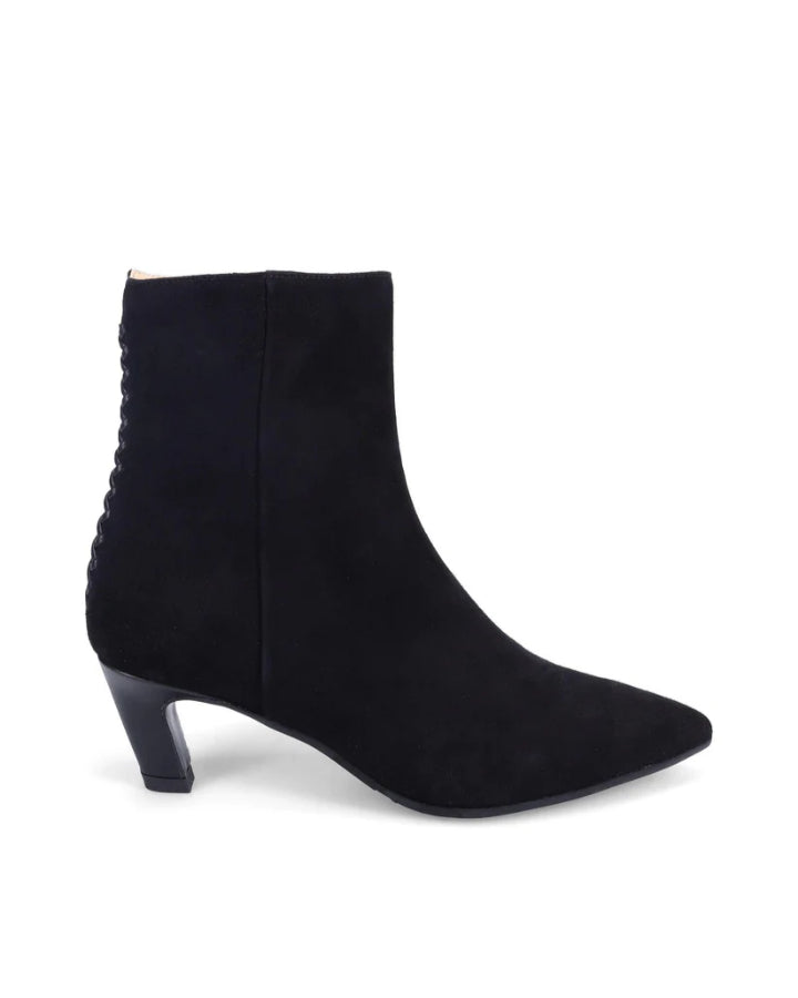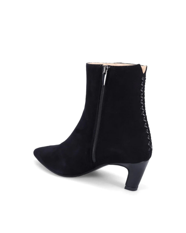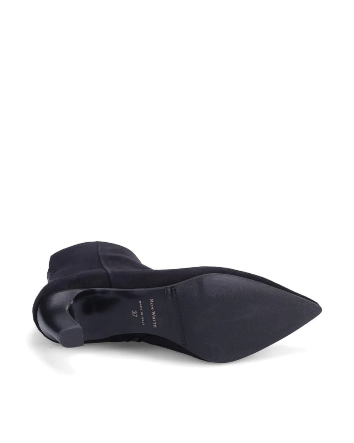 Ron White weatherproof cashmere suede ankle boot with whip stitch detail and inside zipper. Heel 2". Shaft Height 6 1/2". Shaft Circumference 11".