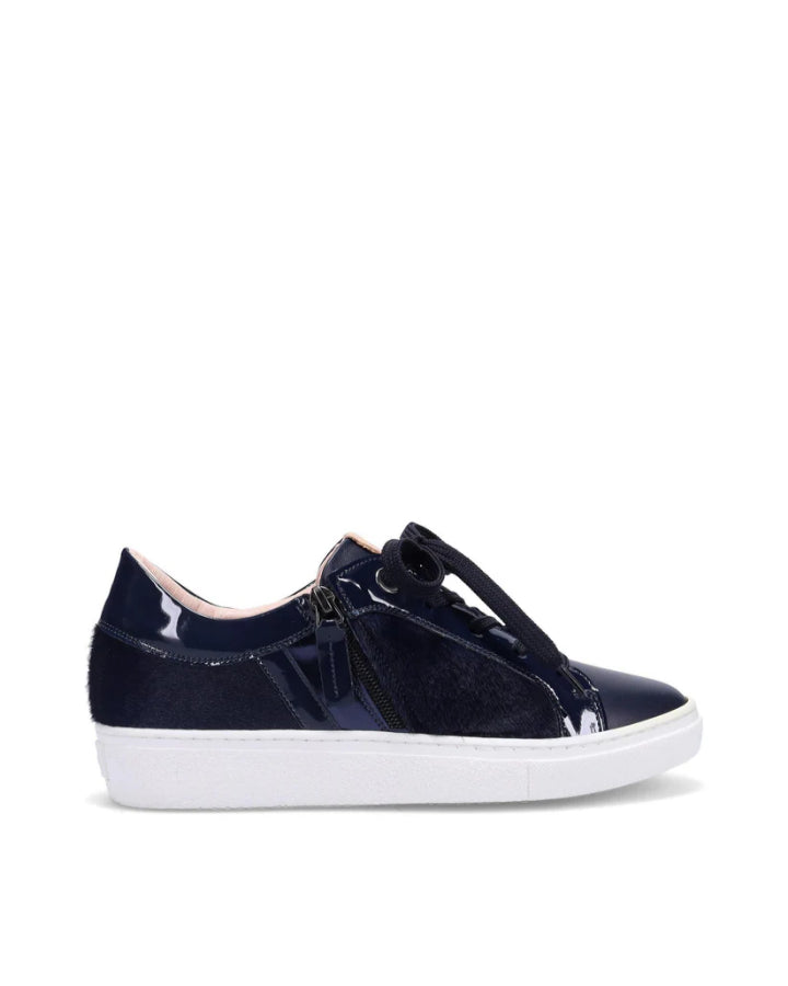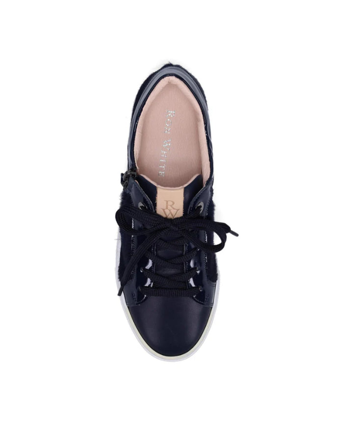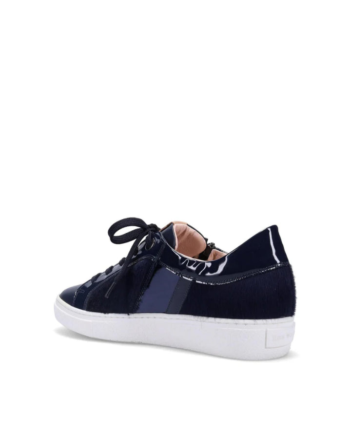 Ron White mixed calf, haircalf and patent trim lace up sneaker with side zipper, full removable footbed with arch support and metatarsal support. Heel 1 1/4".