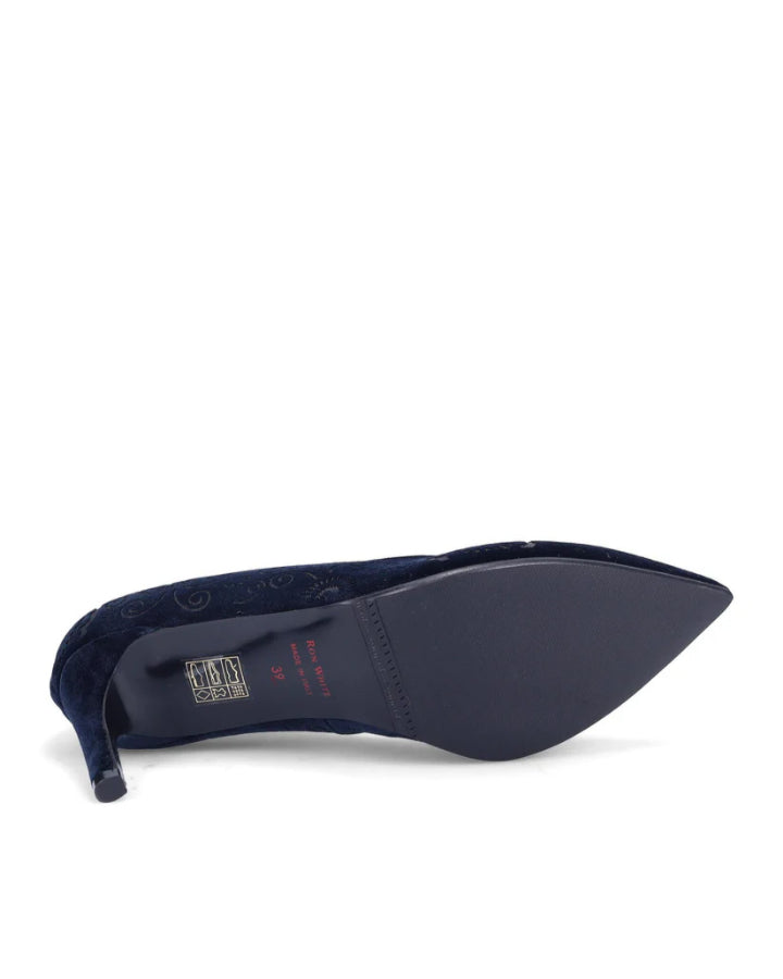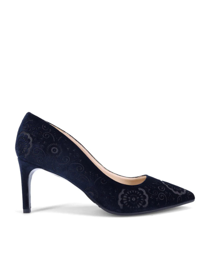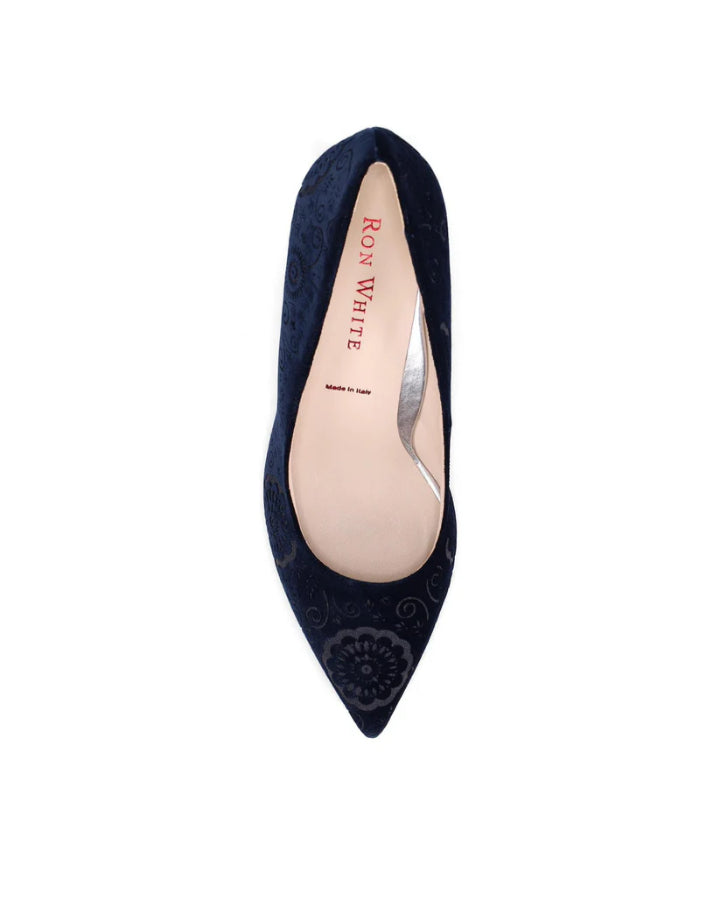 Ron White velvet pump originally designed for London's Devil Wears Prada is crafted in rich velvet with an intricate laser-cut lace pattern, it blends theatrical elegance with real-world comfort. Double padding ensures a plush underfoot feel, Heel 3".