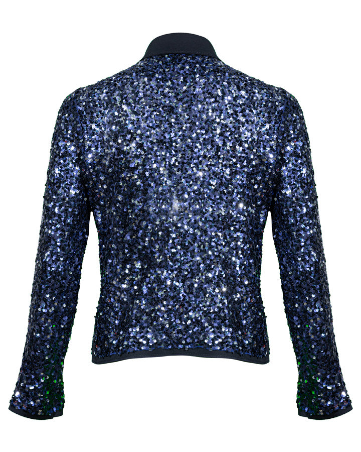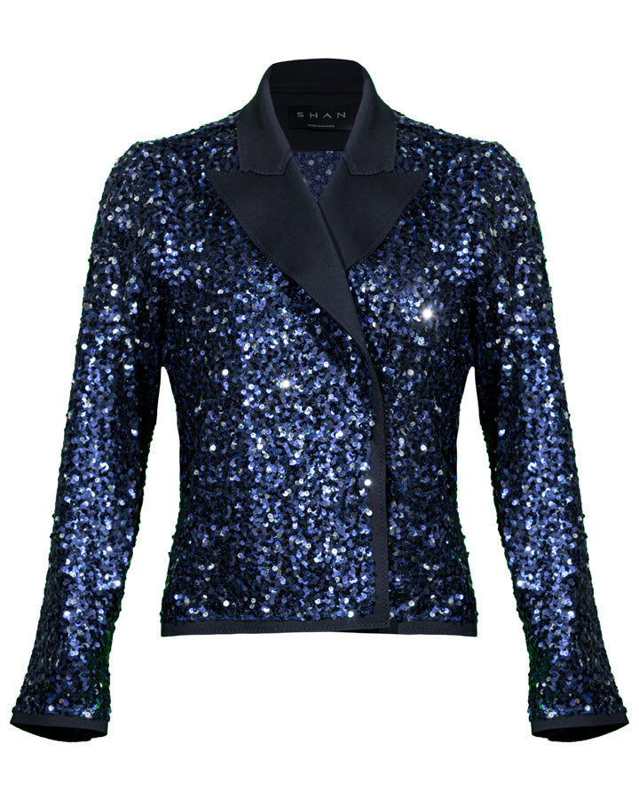 Shan Ariel jacket in a festive nightsky blue sequin with a navy collar and trim.