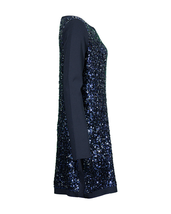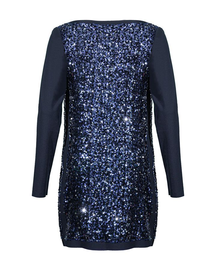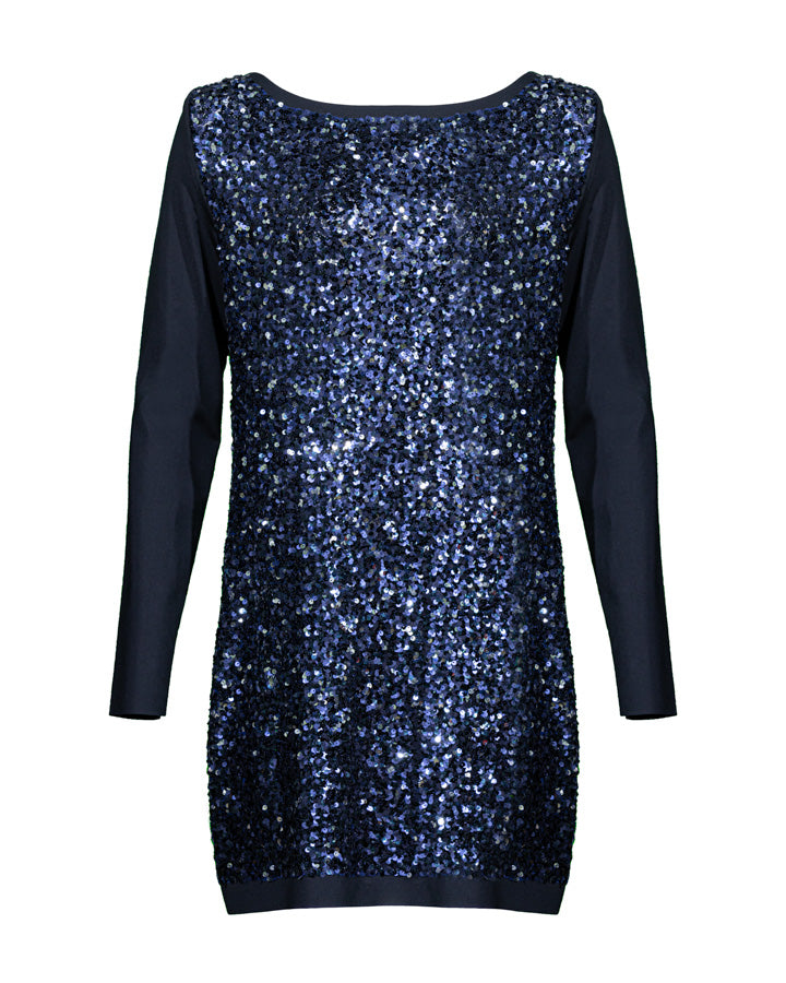 Shan Ariel dress in a glittering nightsky blue sequin body and navy long sleeves and trim. Round neck.